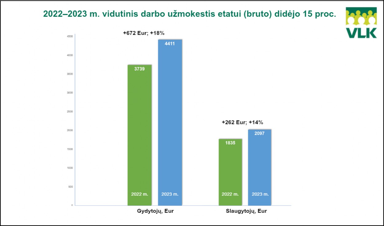 Gydymo įstaigose dirbančių gydytojų, slaugytojų ir kito personalo, teikiančio sveikatos priežiūros paslaugas, vidutinis bruto darbo užmokestis, tenkantis vienam etatui, 2023 m., palyginti su 2022 m., didėjo: gydytojų – 18 proc., slaugytojų – 14 proc., kito personalo, teikiančio sveikatos priežiūros paslaugas – 15 proc.