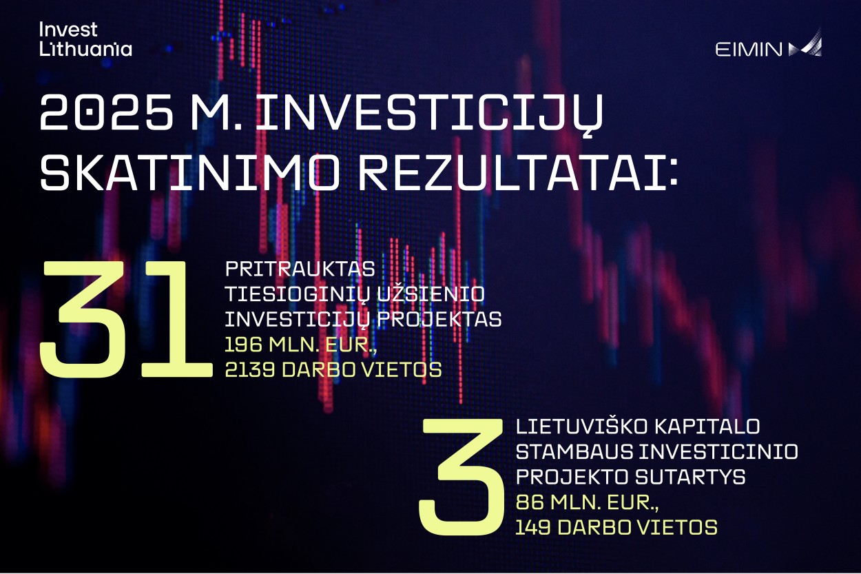 Per 2025-uosius pasiekti tiesioginių užsienio investicijų (TUI) rezultatai kartu uždarė ir „Investuok Lietuvoje“ strateginį laikotarpį. 2021–2025 m., „Investuok Lietuvoje" pritraukė 237 TUI projektus, kurie sukūrė 19,7 tūkst. darbo vietų, o bendra investicijų į ilgalaikį turtą suma pasiekė 1,1 mlrd. eurų.