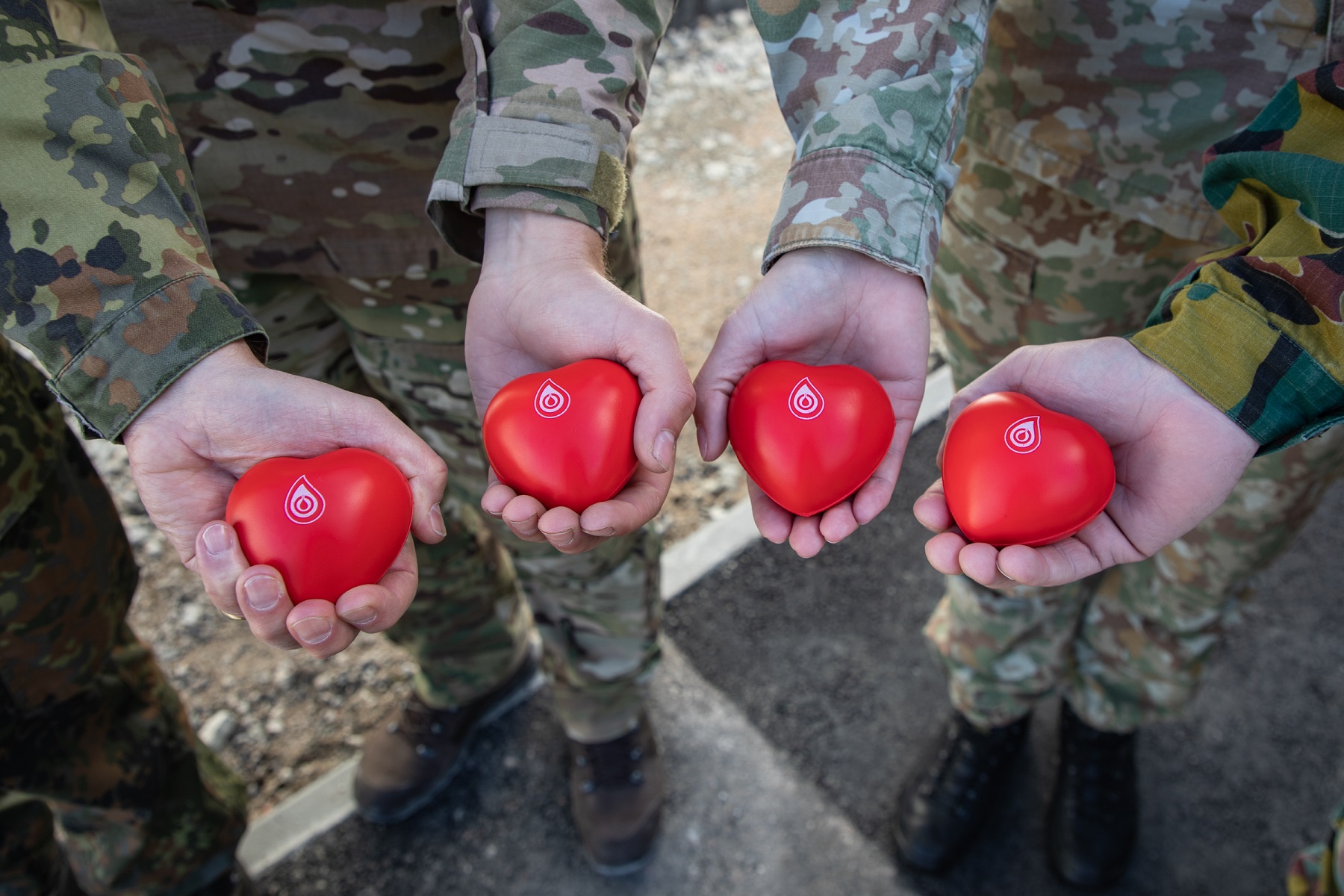 Kraujo donorystės akcijoje dalyvaujantys kariai iš įvairių šalių: Vokietijos, Nyderlandų, Lietuvos ir Belgijos (iš kairės į dešinę).