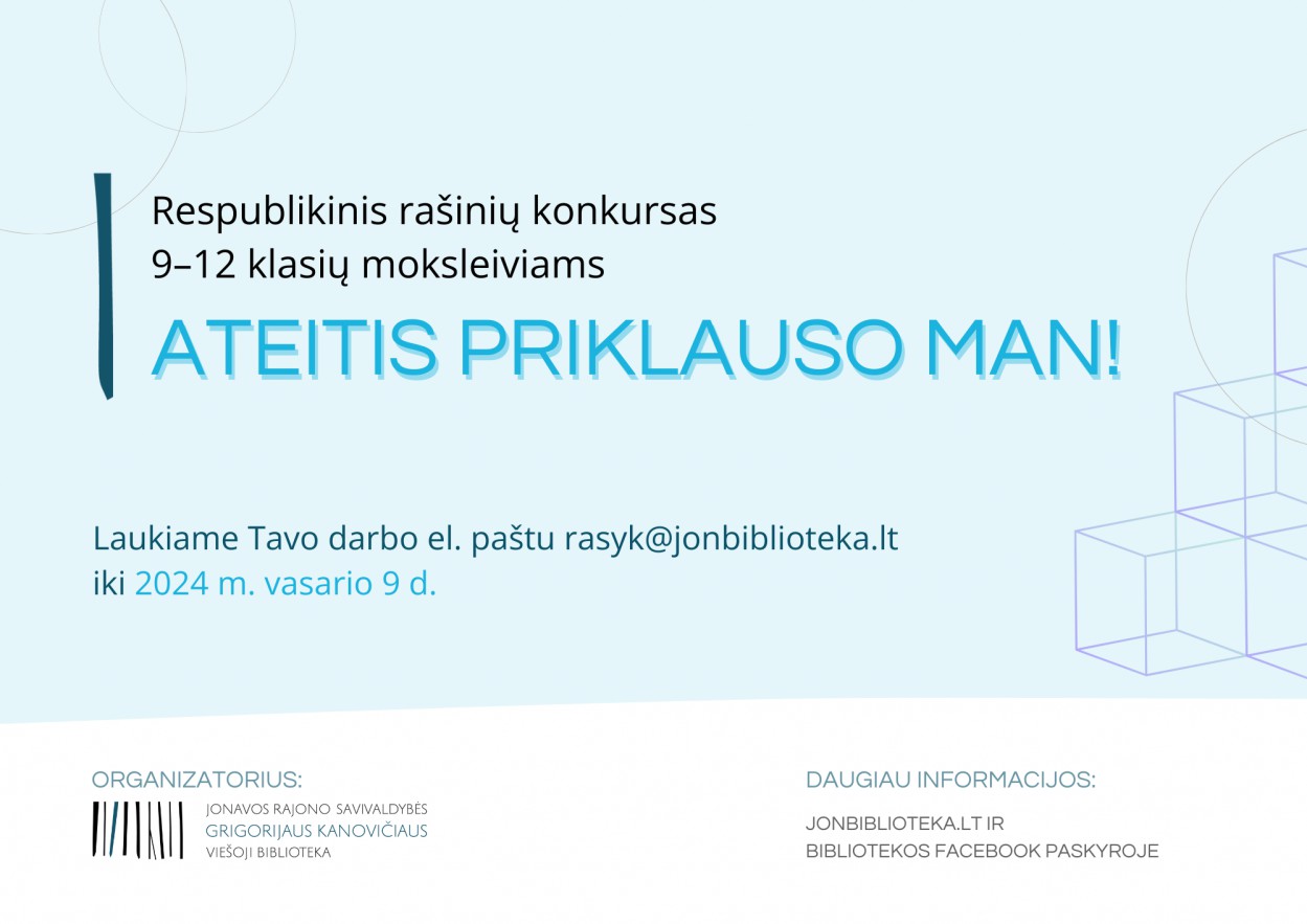 Daugiau informacijos ir konkurso nuostatai: https://jonbiblioteka.lt/skaitytojams/naujienos/912-klasiu-moksleiviai-kvieciami-dalyvauti-rasiniu-konkurse