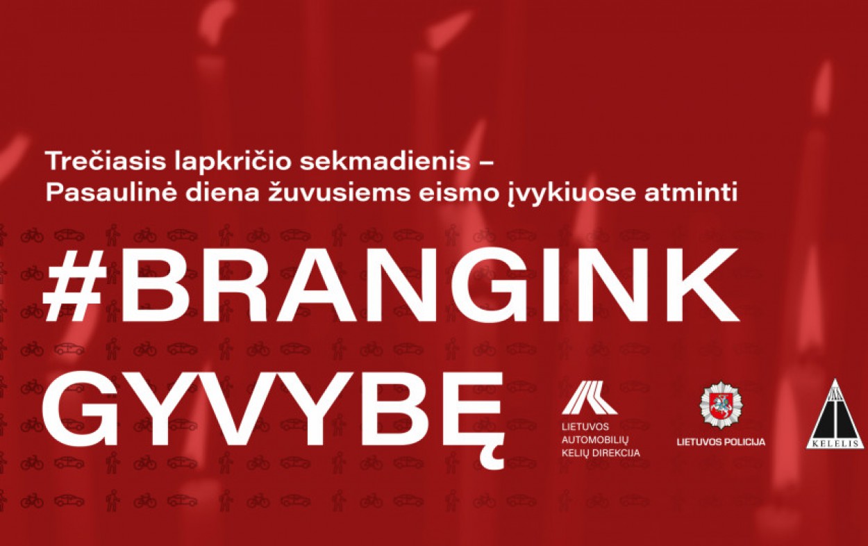 Valstybės įmonė Lietuvos automobilių kelių direkcija (Kelių direkcija) kartu su partneriais – Lietuvos policija ir jaunųjų kelininkų klubu „Kelelis“ – šių metų lapkričio 21 d., sekmadienį, kviečia paminėti Pasaulinę dieną žuvusiems eismo įvykiuose atminti. Šią dieną Katedros aikštėje, Vilniuje, vyks akcija „Brangink gyvybę“ , kurios metu Vilniaus arkikatedros bazilikos fasadas nuo 17.00 iki 22.00 val. bus apšviestas stacionariu apšvietimu, ant pastato sienos sužibs žvakės ir kiti simboliai, primenantys, kaip svarbu branginti savo ir kitų gyvybę. Šalia arkikatedros bazilikos veiks jaunųjų kelininkų klubo „Kelelis“ parengta nuotraukų, kuriose užfiksuoti eismo įvykiai, ekspozicija.
