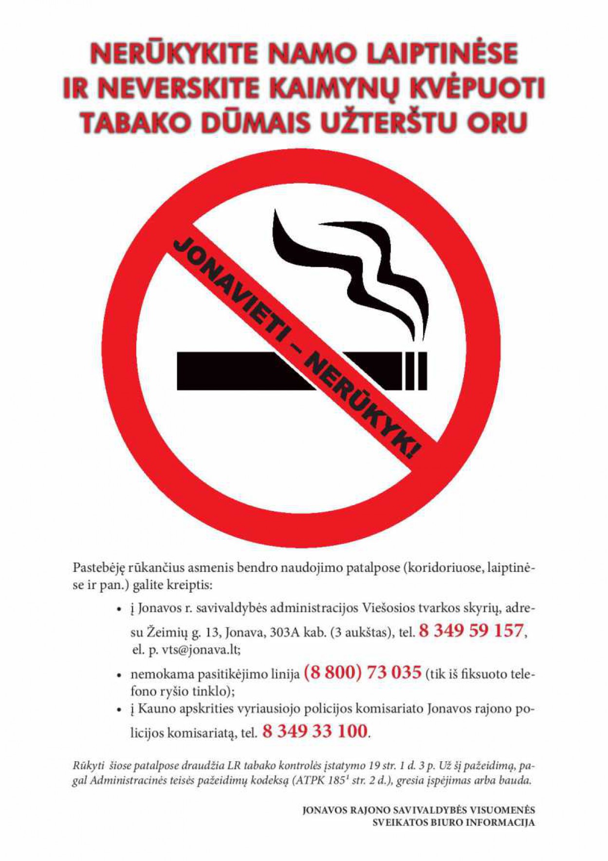 Pastebėję rūkančius asmenis bendro naudojimo patalpose (koridoriuose, laiptinėse ir pan.) nebūkite abejingi, rūpinkitės savo sveikata, perspėkite rūkančiuosius ir paprašykite gerbti Jūsų teises, taip pat galite kreiptis plakate nurodytais telefonų numeriais.