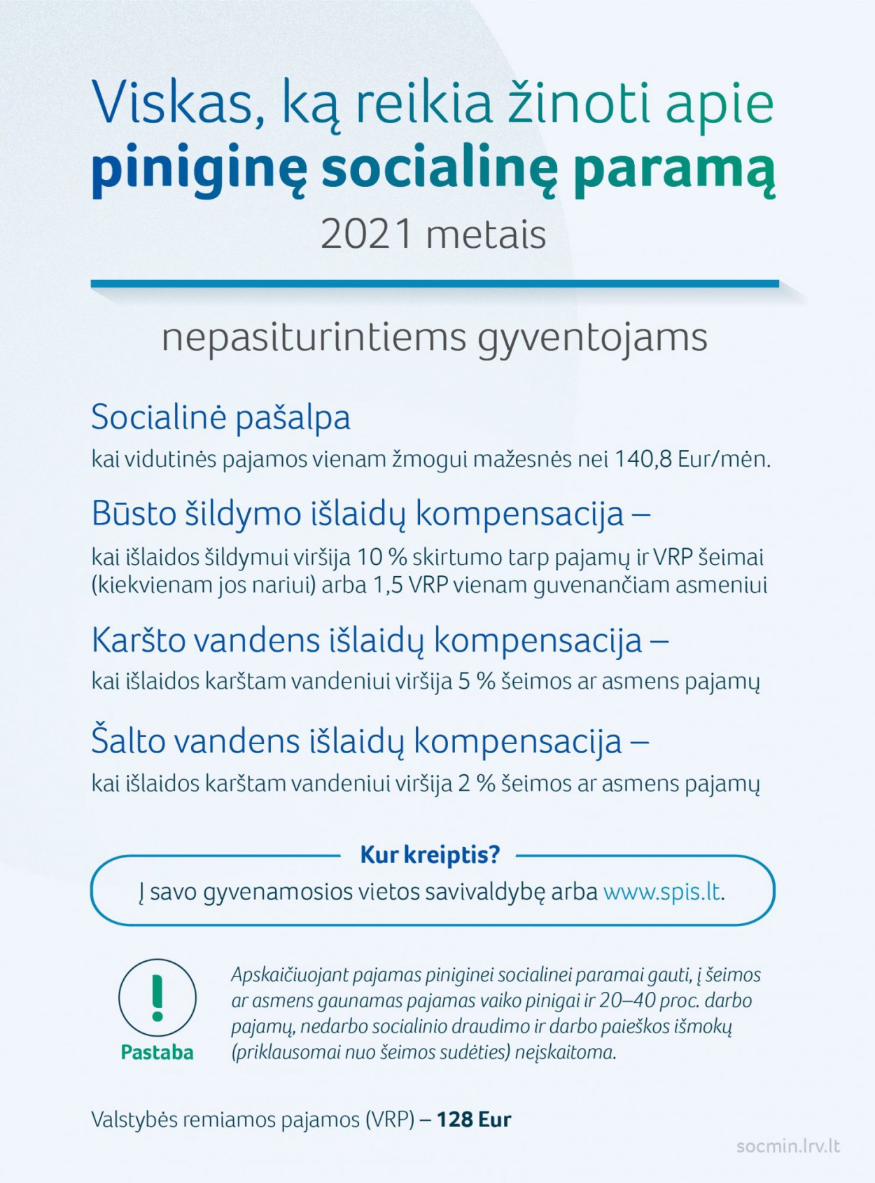PINIGINĖ SOCIALINĖ PARAMA NEPASITURINTIEMS. Su finansiniais sunkumais susidūręs asmuo į savo savivaldybę gali kreiptis piniginės socialinės paramos: socialinės pašalpos, būsto šildymo ir vandens išlaidų kompensacijų. 2021 metais teisę į socialinę pašalpą įgis asmenys, kurių vidutinės mėnesio pajamos asmeniui neviršys 140,8 eurų.