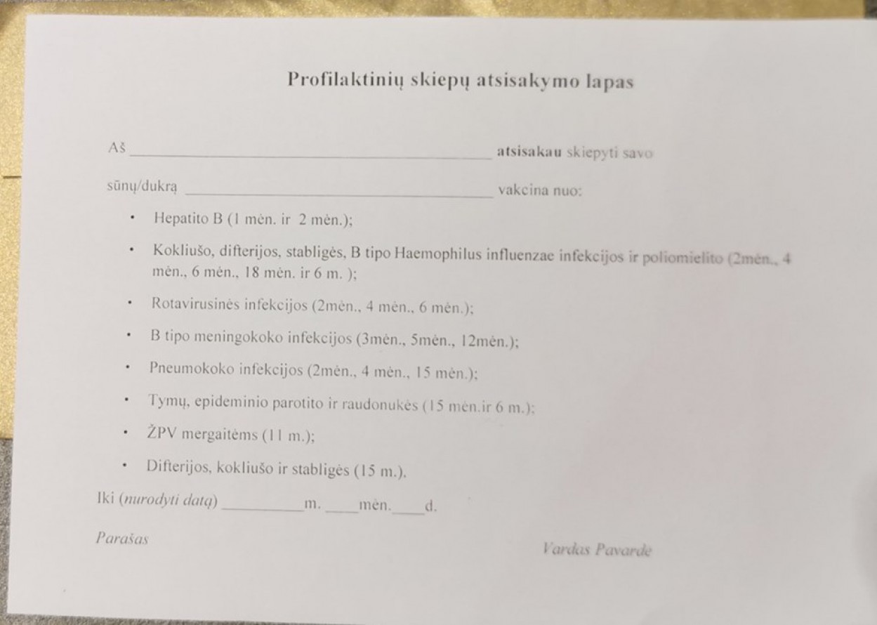 „Kai protingi tėvai atsisako skiepais luošinti savo vaikus, jiems iš karto pakišinėjamos tokios pažymos, kad atsisakau ir taip toliau, taip toliau... Man iš karto pasidarė įdomu – kas čia per velniava? Kur tos pažymos eina? Į kokius seifus, ar ministerijas? Kam jas reikia pasirašinėti? Aš pasakiau – nenoriu, ir to turėtų užtekti. Juk skiepai nėra prievartiniai. O man Jonavos medikai pasakė, kad tos pažymos siunčiamos kažkur į aukštesnę instanciją, bet kai pasidomėjau plačiau, pasiskambinau į Vilnių, pasirodo, jos niekur nesiunčiamos. Vadinasi, šita instancija (Jonavos PPSC – red.past.) užsiiminėja saviveikla. Išduota atsisakymo pažyma, bet joje nėra parašyta, kas ją paruošė, kas spausdino ir pan. Mes pirmą kartą gavę tokią atsisakymo pažymą, jokiais būdais nepasirašėm jos, guli dabar stalčiuj ir tiek, bet mane sunervavo – kam gąsdinti kitus žmonės? Juk dėl skiepų žalos luošų vaikų ir taip pilna, serga visi, o čia dar papildomos pažymos, papildoma tėvų gąsdinimo priemonė – va, tu atsisakei, lauk bėdos.