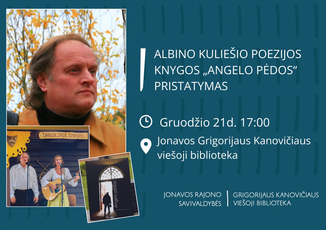 Belaukiant gražiausių metų švenčių, Jonavos Grigorijaus Kanovičiaus viešoji biblioteka kviečia į poezijos vakarą - Albino Kuliešio poezijos knygos „Angelo pėdos“ pristatymą.