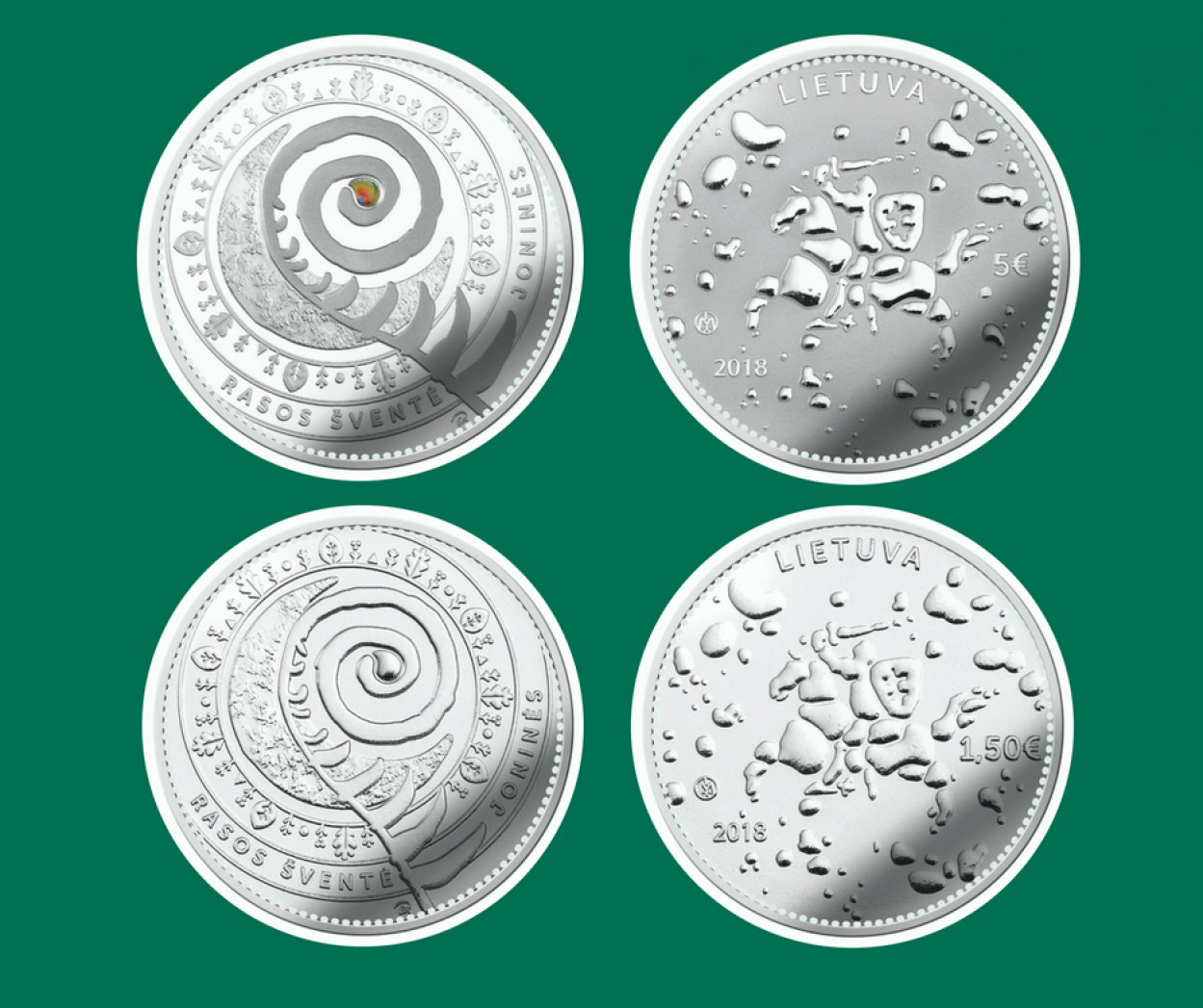 Joninių (Rasos) šventei skirta 5 eurų sidabro moneta bus išleista 3 000 vnt., o pusantrokas – 30 tūkst. vnt. tiražu. Abiejų monetų reverse pavaizduoti Joninių šventės simboliai – besiskleidžiantis paparčio lapas, mėnuo, saulė ir žolynų vainikas, sujungti į vieną sūkurį, kurio centre yra stilizuotas paparčio žiedas, tarsi prasišviečiantis per rasos lašą. Sidabro monetoje jis yra spalvotas, o paparčio žiedo įspūdžiui sudaryti panaudota reljefo dengimo spalvomis technologija. Monetų reverse – iš vandens lašelių susiformuojantis Vytis.