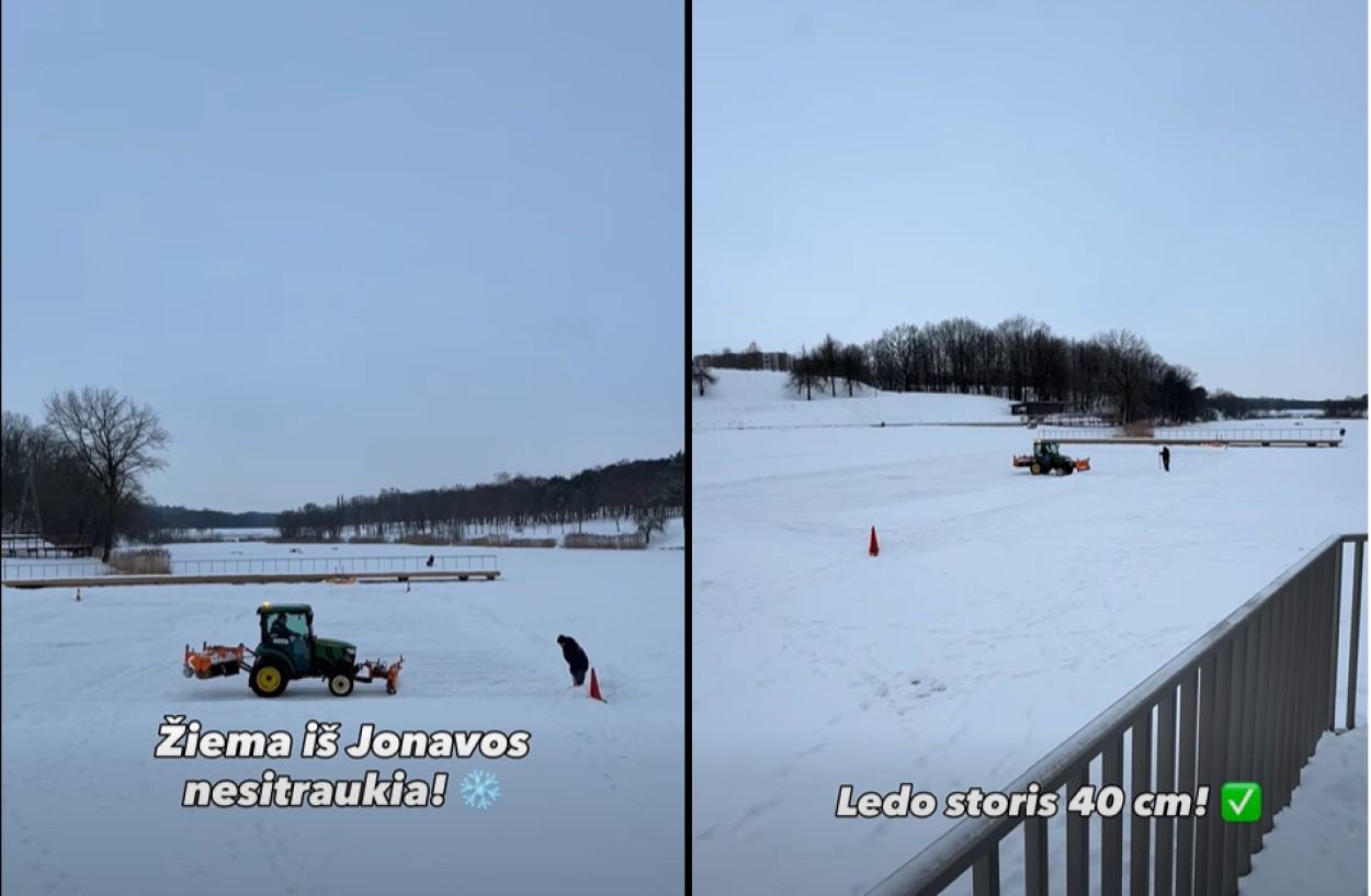 Jonavoje - netikėta žinia: ant Joninių tvenkinio ruošiama natūralaus ledo čiuožykla. Savivaldybės vicemeras Povilas Beišys socialiniame tinkle pasidalijo vaizdo įrašu, kuriame matyti, kaip ant įšalusio Joninių tvenkinio ledo dirba traktorius – valomas sniegas.