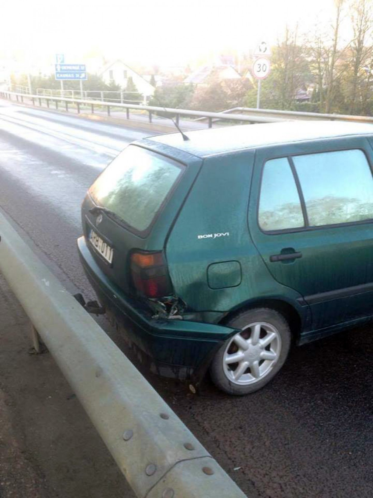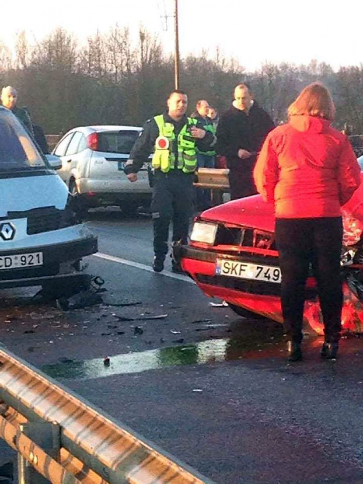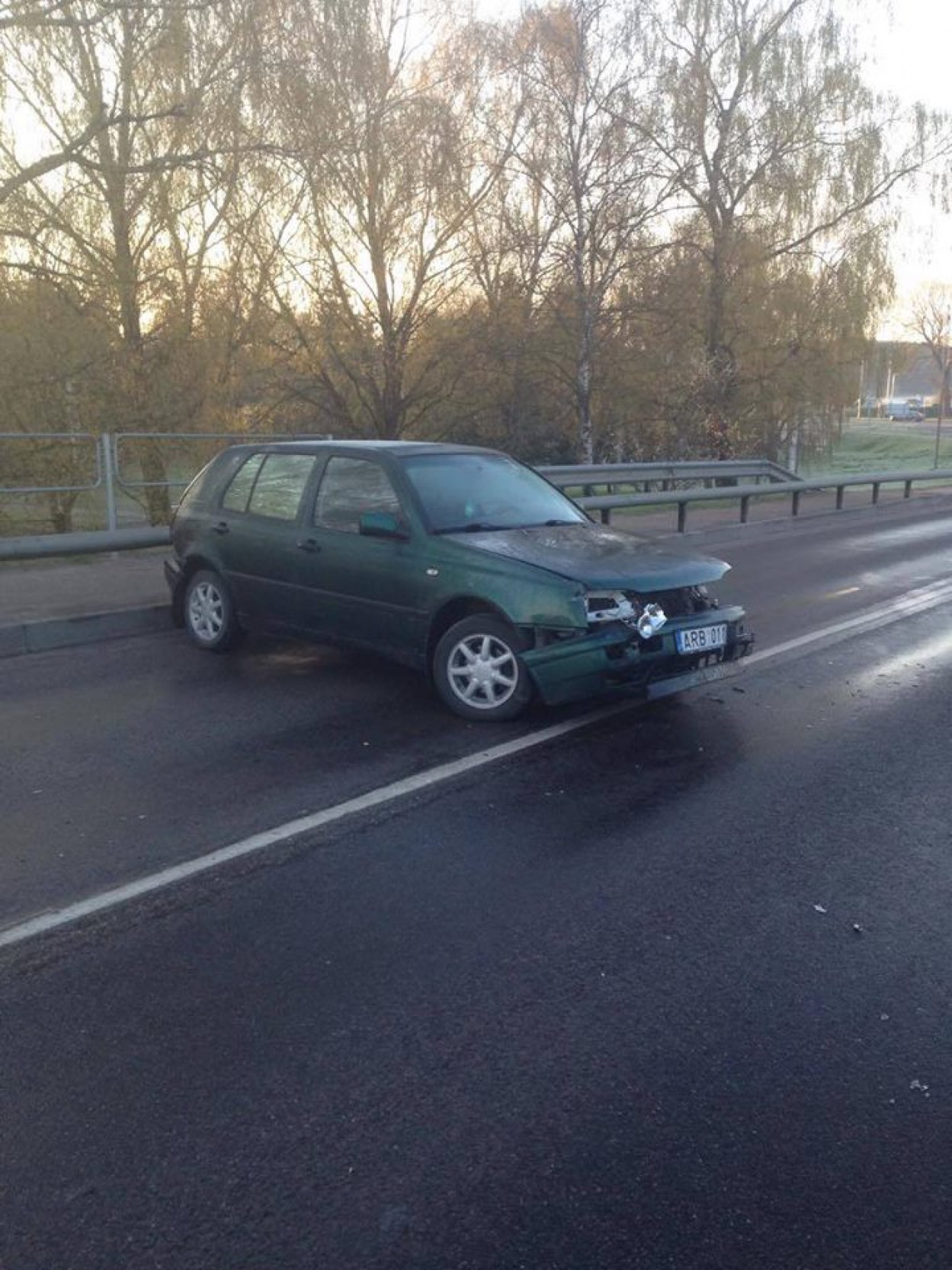 Dėl slidžios kelio dangos į tilto atitvarą atsitrenkė vienas automobilis, o paskui jį – dar trys transporto priemonės.