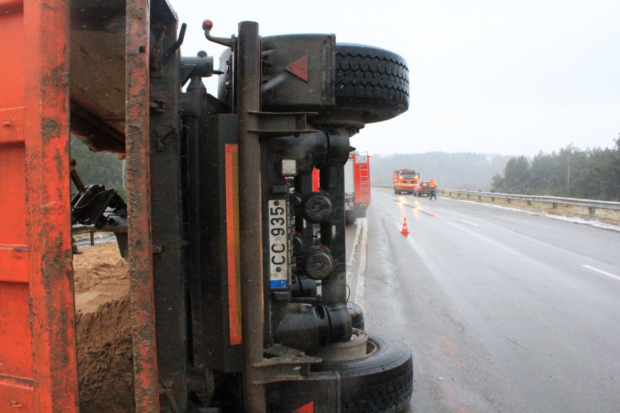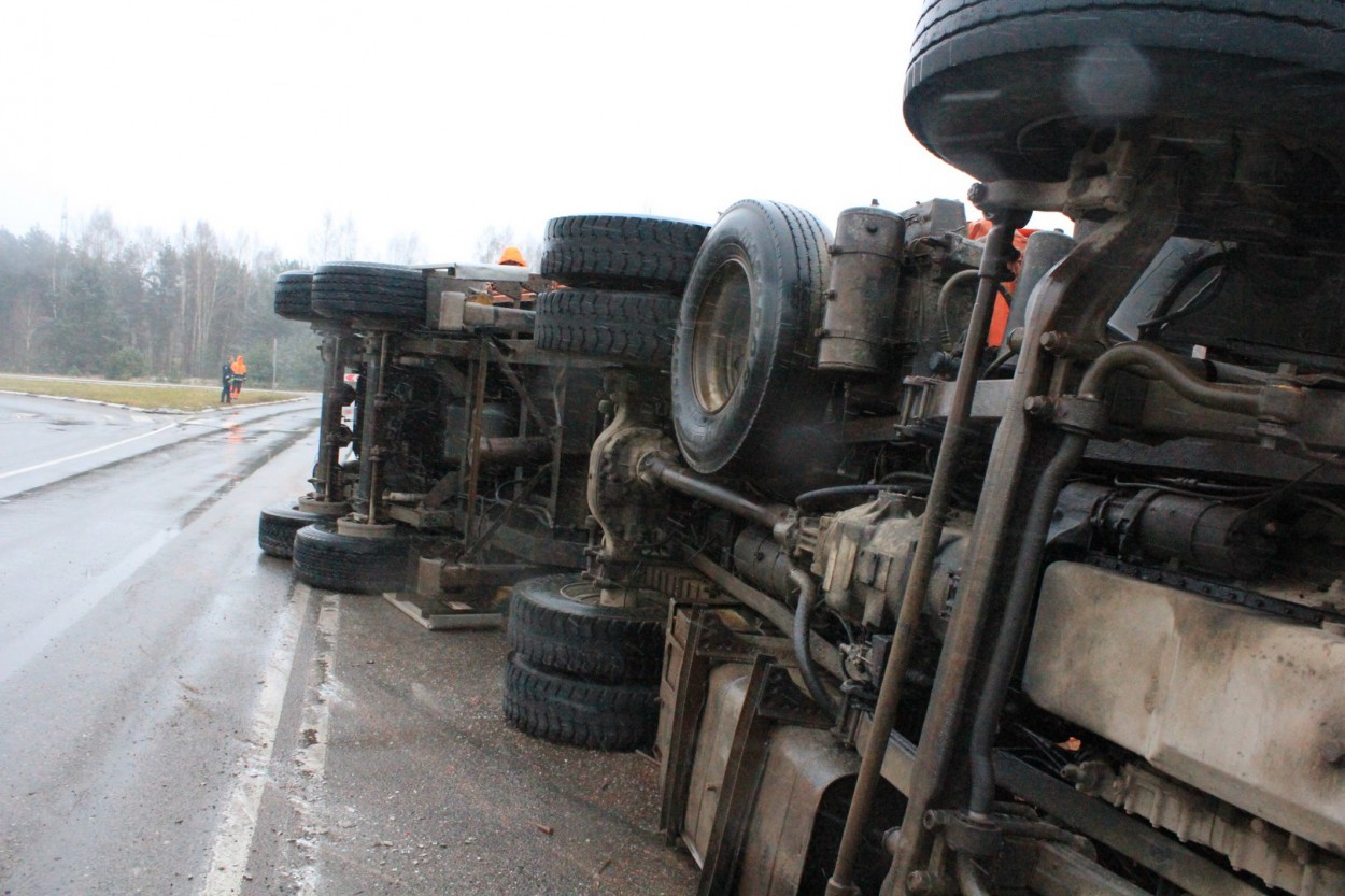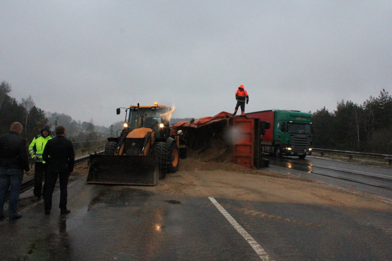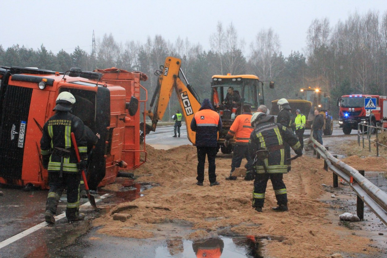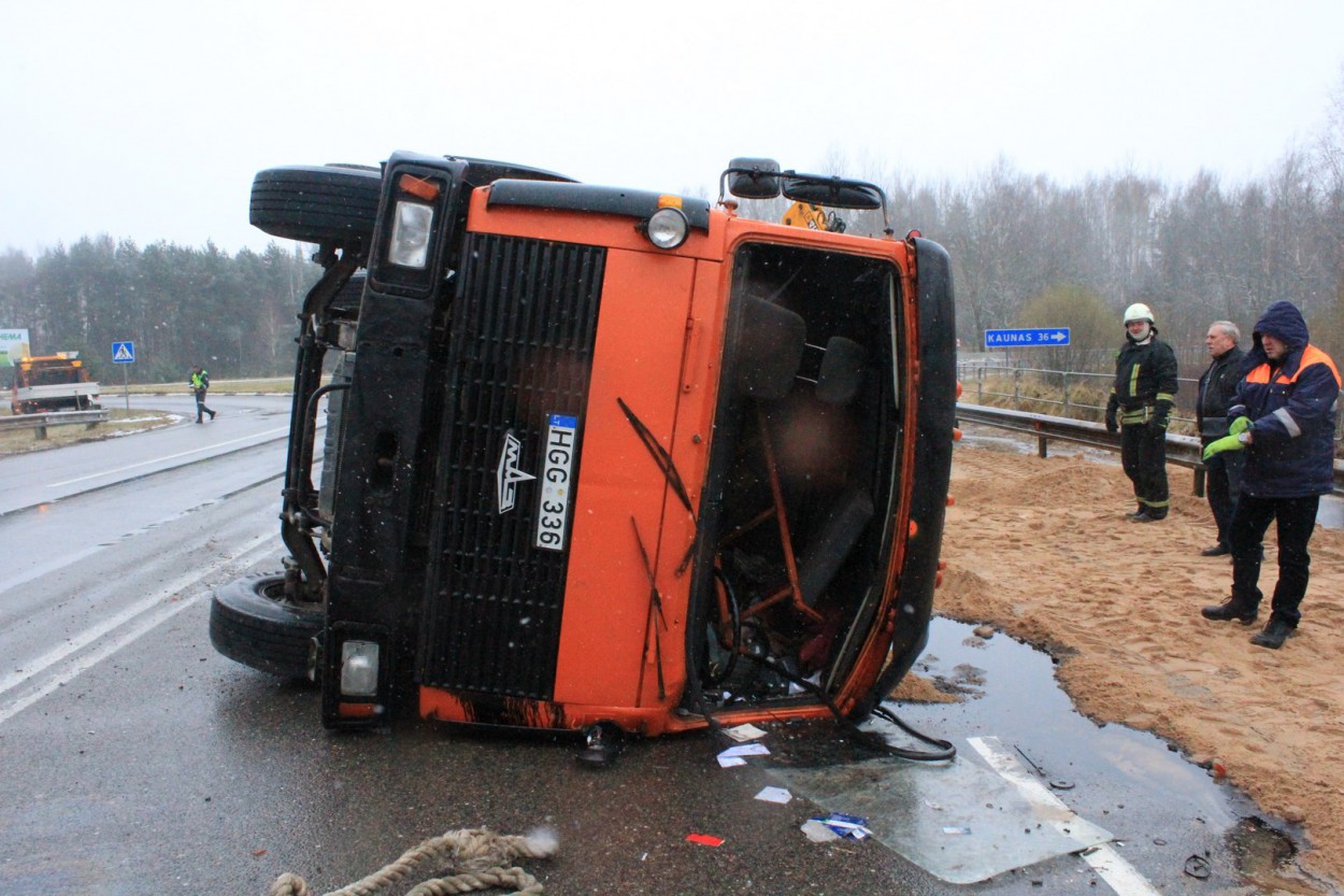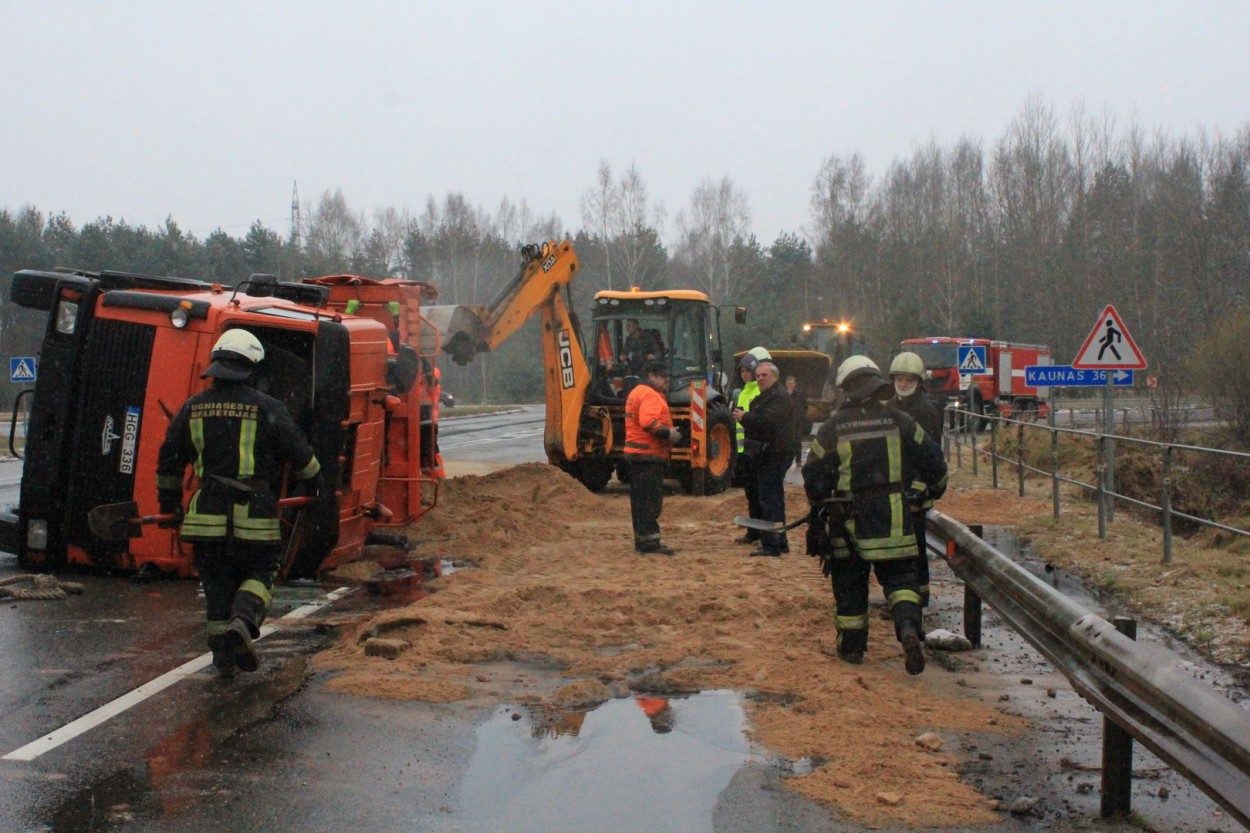Į avariją patekęs automobilis priklauso bendrovei „Kauno regiono keliai“, juo buvo vežamas gatvių barstymui skirtas smėlis.