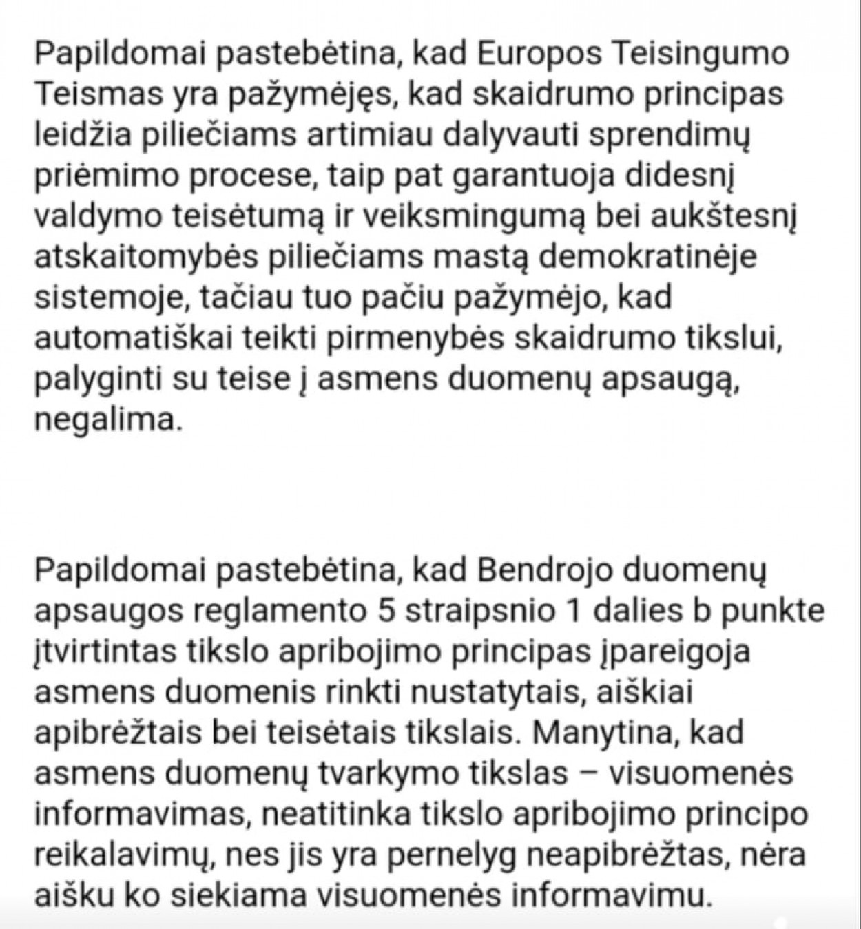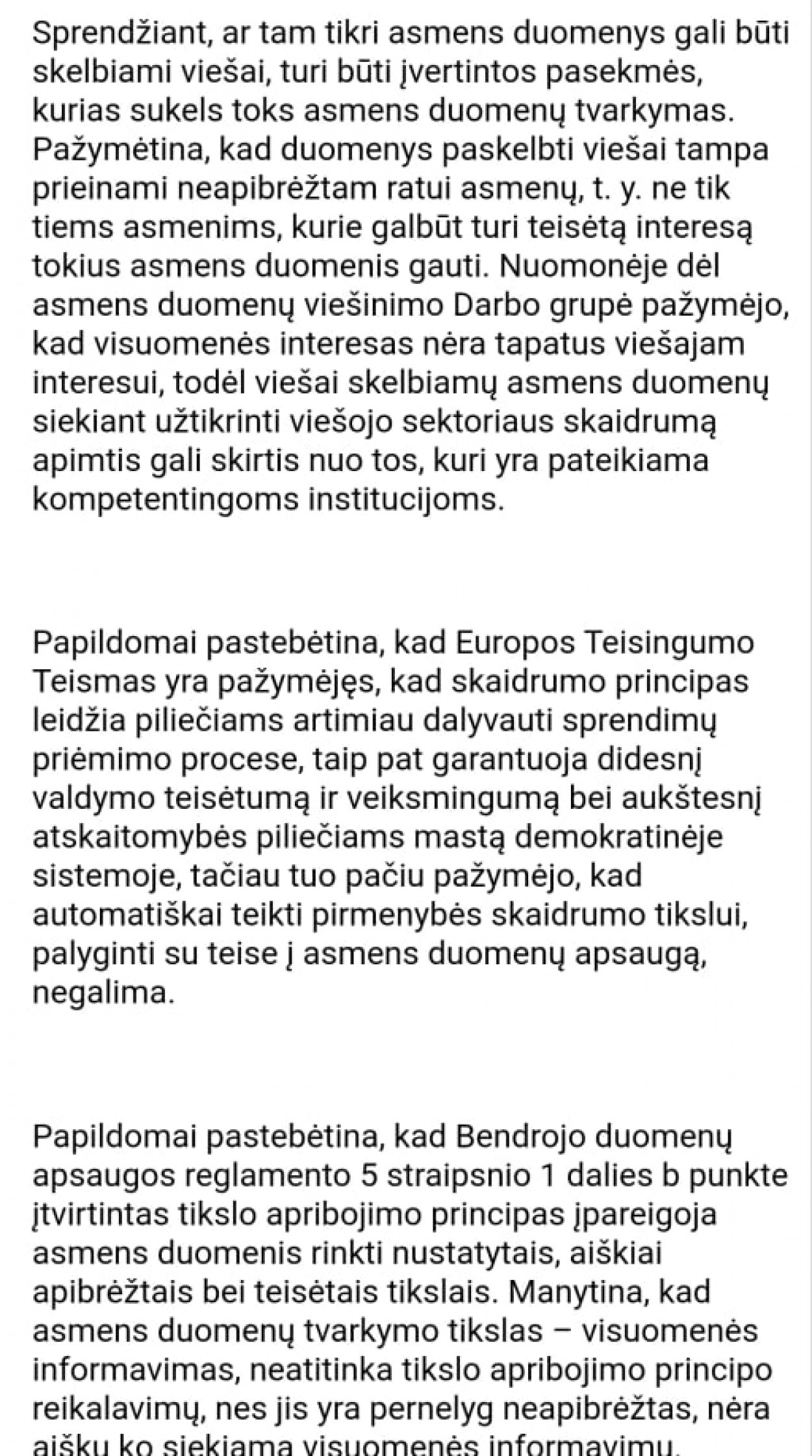 ,,Vadovaujantis Bendrojo duomenų apsaugos reglamento 4 straipsnio 1 punktu, kuriame įtvirtinta asmens duomenų sąvoka, asmens duomenimis iš esmės galima laikyti bet kurią su fiziniu asmeniu susijusią informaciją. Visgi Jūsų nurodytoje situacijoje svarbiausia yra tai, kad kalbame apie viešuosius asmenis, t. y. Tarybos narius, kurie kanceliarinėms išlaidoms naudoja viešuosius išteklius, t. y. mokesčių mokėtojų pinigus. Kaip žinia, viešieji asmenys nesinaudoja tokia pačia asmeninių neturtinių teisių (teisės į privataus gyvenimo apsaugą) gynyba, kaip privatūs asmenys. Didesnis visuomenės ir žiniasklaidos dėmesys tokiems asmenims yra visiškai normalus ir pateisinamas dalykas, todėl, mūsų nuomone, dangstymas(is) asmens duomenų apsauga šiuo atveju yra visiškai netinkama praktika, nesiderinanti su demokratinės visuomenės interesu užtikrinti viešųjų išteklių panaudojimo skaidrumą. Apibendrinant, žurnalistai turi teisę gauti informaciją apie Tarybos narių kanceliarinių išlaidų panaudojimą, nes tai sąlygoja viešasis visuomenės interesas“, - tikino Žurnalistų etikos inspektoriaus tarnybos patarėja Jūratė Kučinskaitė.
