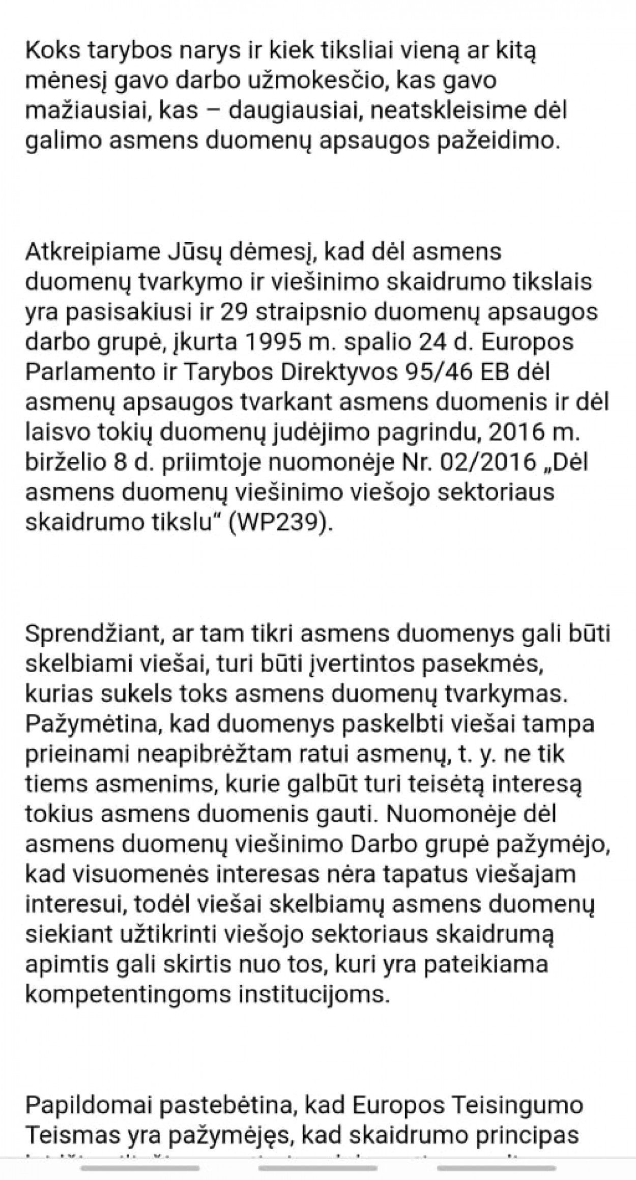 ,, (...) Koks tarybos narys ir kiek tiksliai vieną ar kitą mėnesį gavo darbo užmokesčio, kas gavo mažiausiai, kas – daugiausiai, neatskleisime dėl galimo asmens duomenų apsaugos pažeidimo (...) “, - rašoma E. Utyros atsiųstame elektroniniame laiške.
