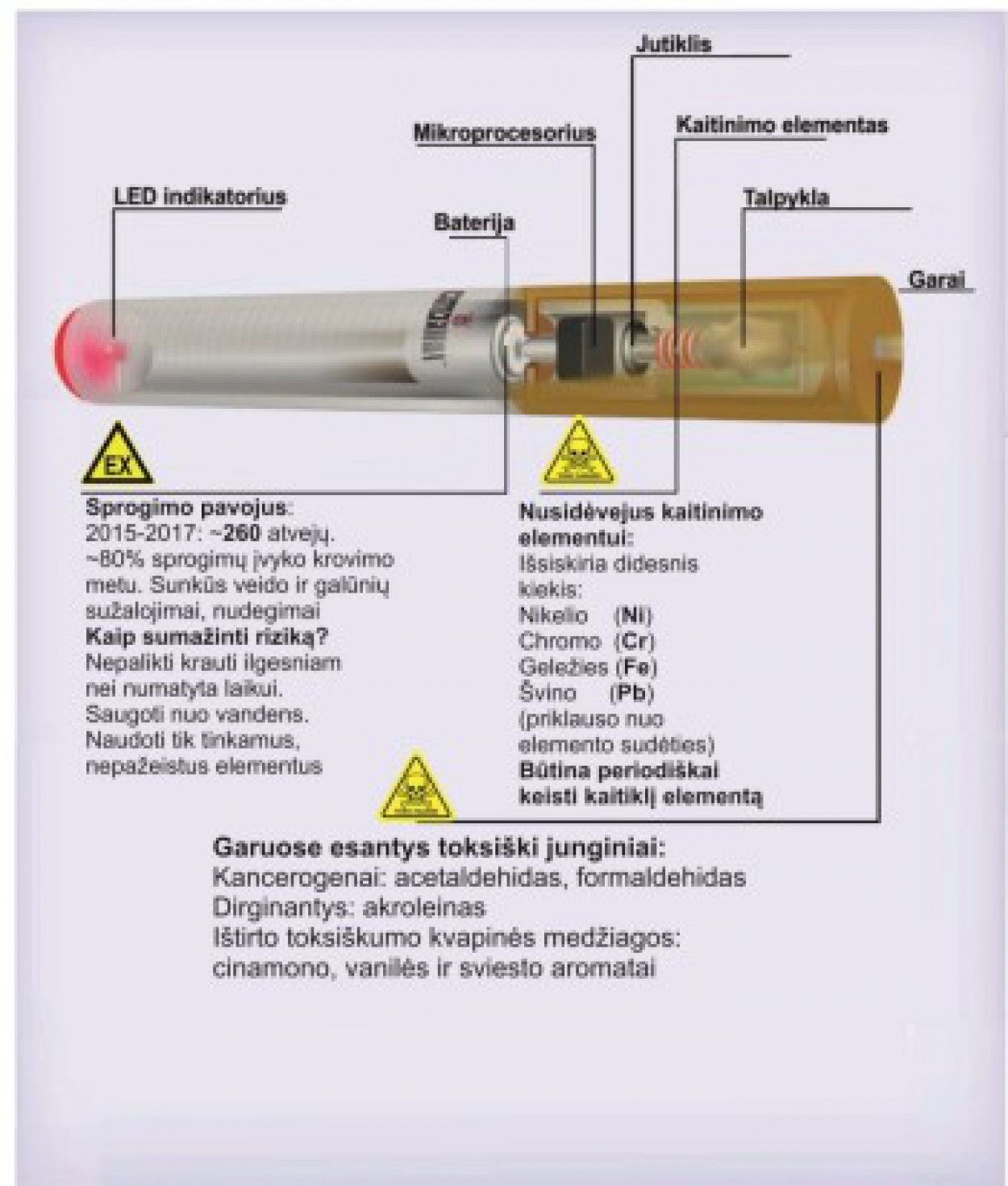 Vis dar nėra atlikta pakankamai tyrimų, kurie įrodytų, jog elektroninės cigaretės yra nekenksmingos, todėl manoma, kad jų įtaka žmogaus sveikatai yra panaši kaip klasikinių cigarečių. Nėra visiškai nežalingo rūkymo būdo, todėl pakeitus įprastas tabako cigaretes cigaru, pypke, kaljanu ar elektronine cigarete, neišvengsime su rūkymu susijusios rizikos sveikatai. Tabako dūmuose randama per 4000 cheminių junginių, iš kurių net keli šimtai laikomi kenksmingais sveikatai, o apie 40 iš jų yra patvirtinti kancerogenais, kurie sukelia vėžį ar skatina jo vystymąsi. O kas slypi elektroninių cigarečių iškvėpiamame aerozolyje? Paprastai tai nikotinas, įvairūs lakūs organiniai junginiai, kietosios dalelės, sunkieji metalai, įvairūs skonio ir kvapo stiprikliai bei įvairios kancerogeninės medžiagos (2 pav.). Nereikia būti chemiku, kad, panagrinėjus aerozolio sudėtį, suprastum, jog elektroninės cigaretės visgi nėra toks jau nekaltas konvencinių cigarečių pakaitalas.