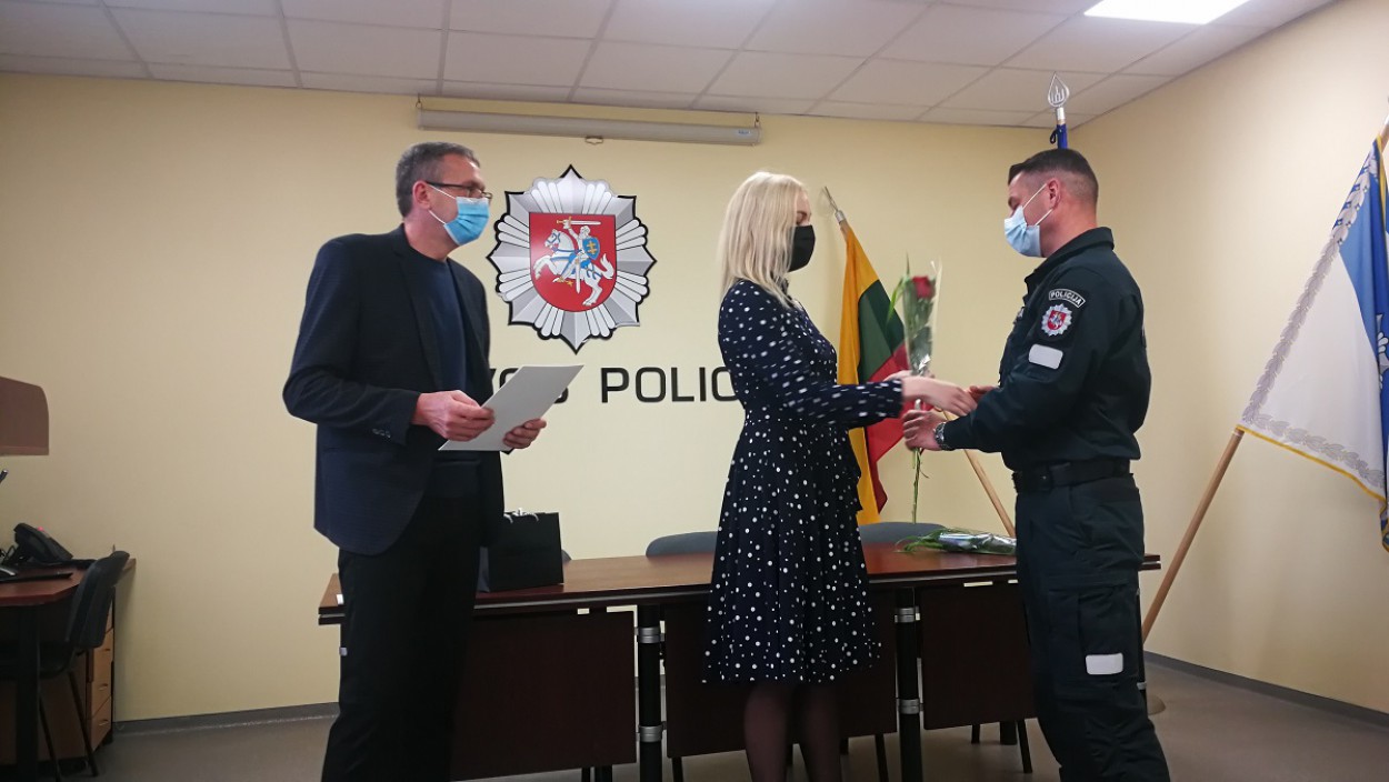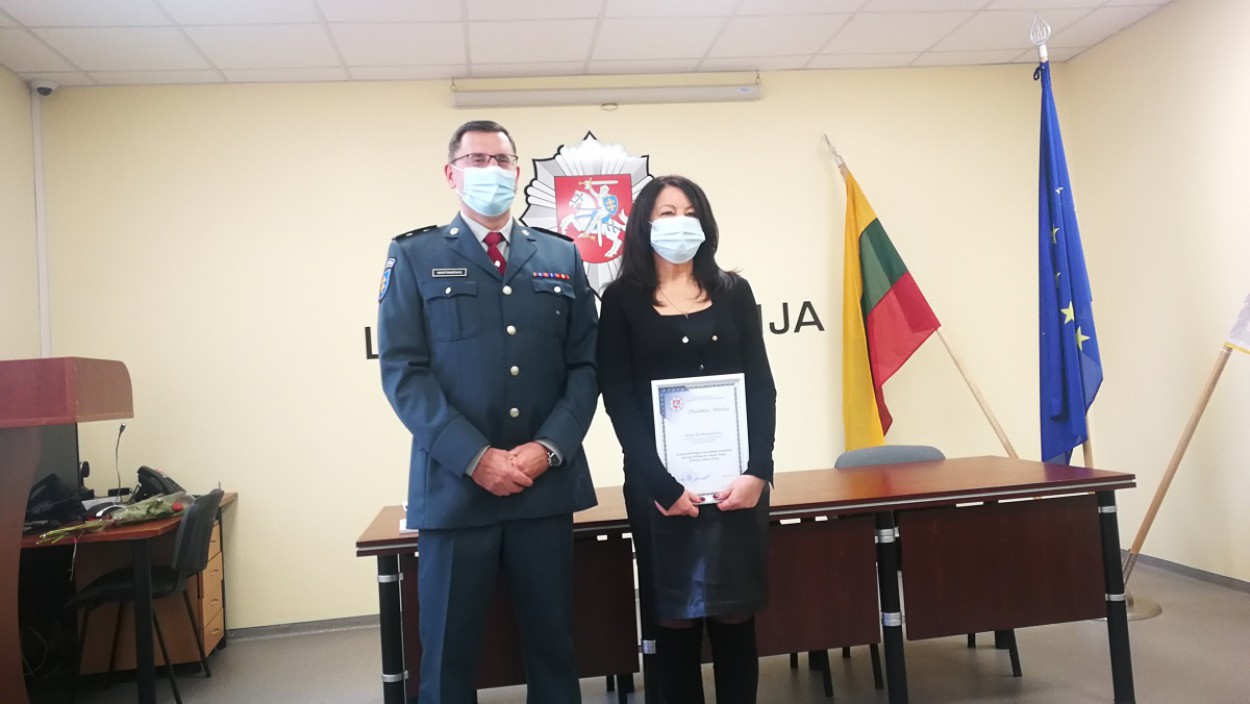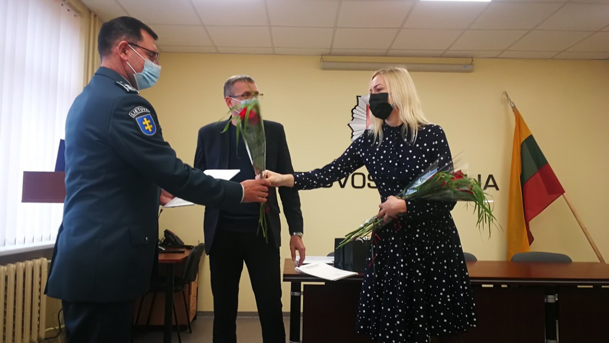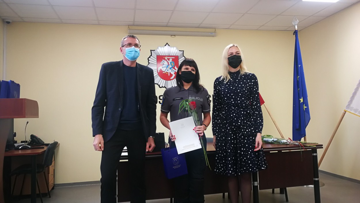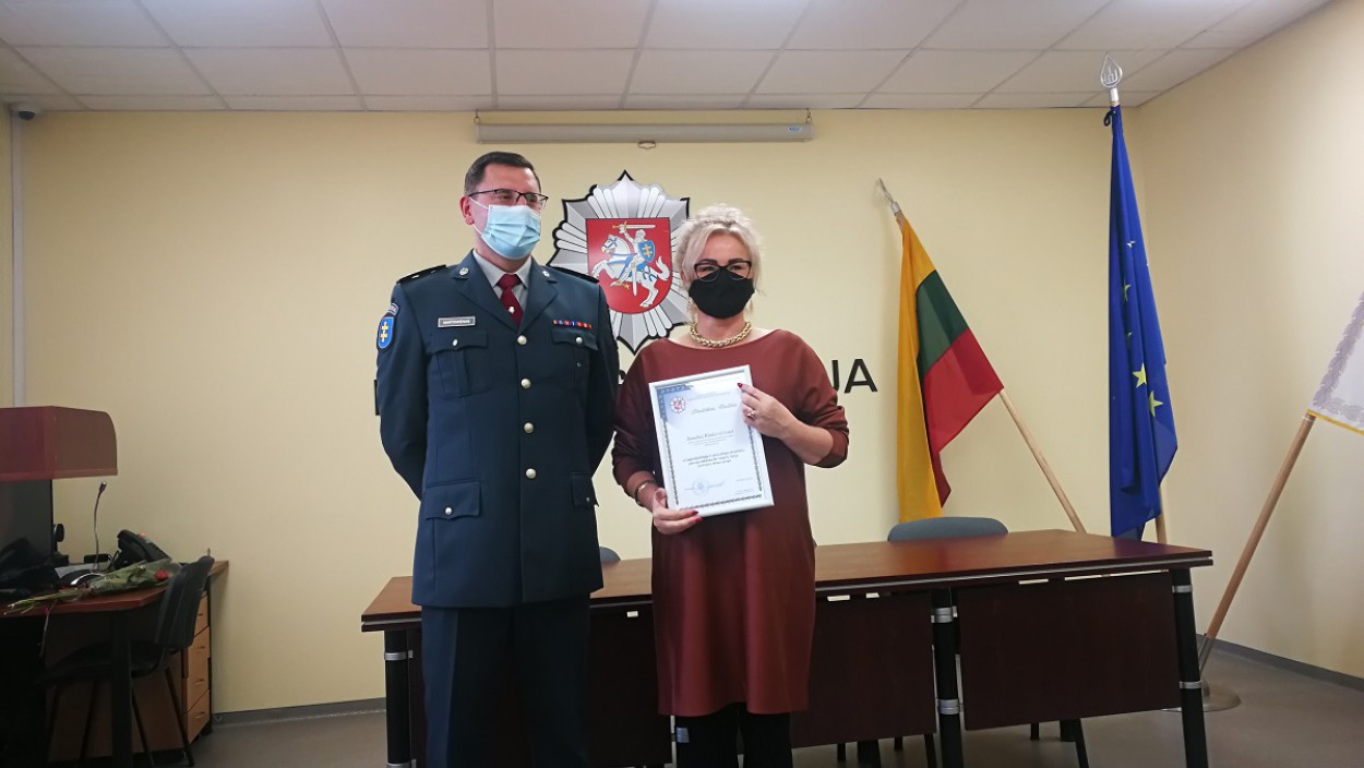 Vardinėmis dovanomis apdovanoti: Jonavos rajono policijos komisariato veiklos skyriaus vyresnysis tyrėjas komisaras inspektorius Justinas Sabatauskas ir Jonavos rajono policijos komisariato veiklos skyriaus vyresnioji tyrėja komisarė inspektorė Indrė Gudauskaitė.