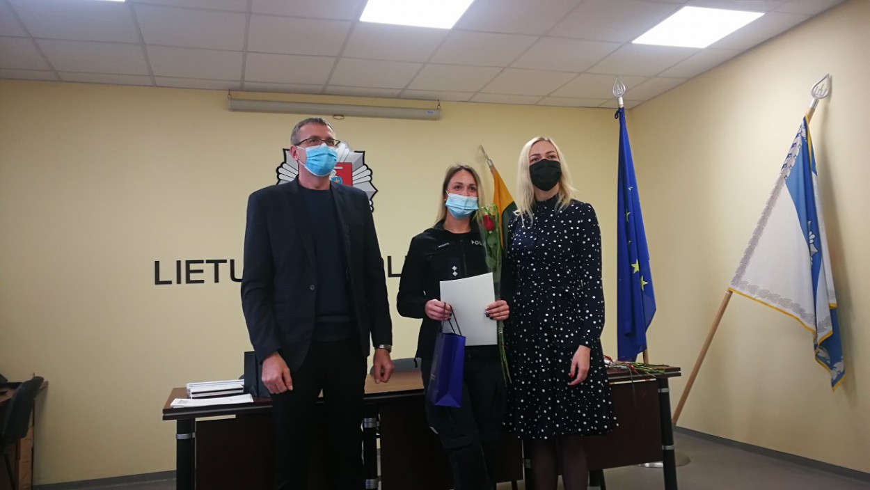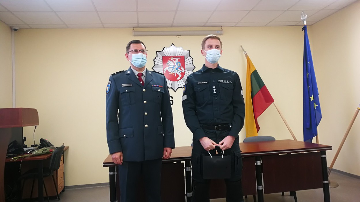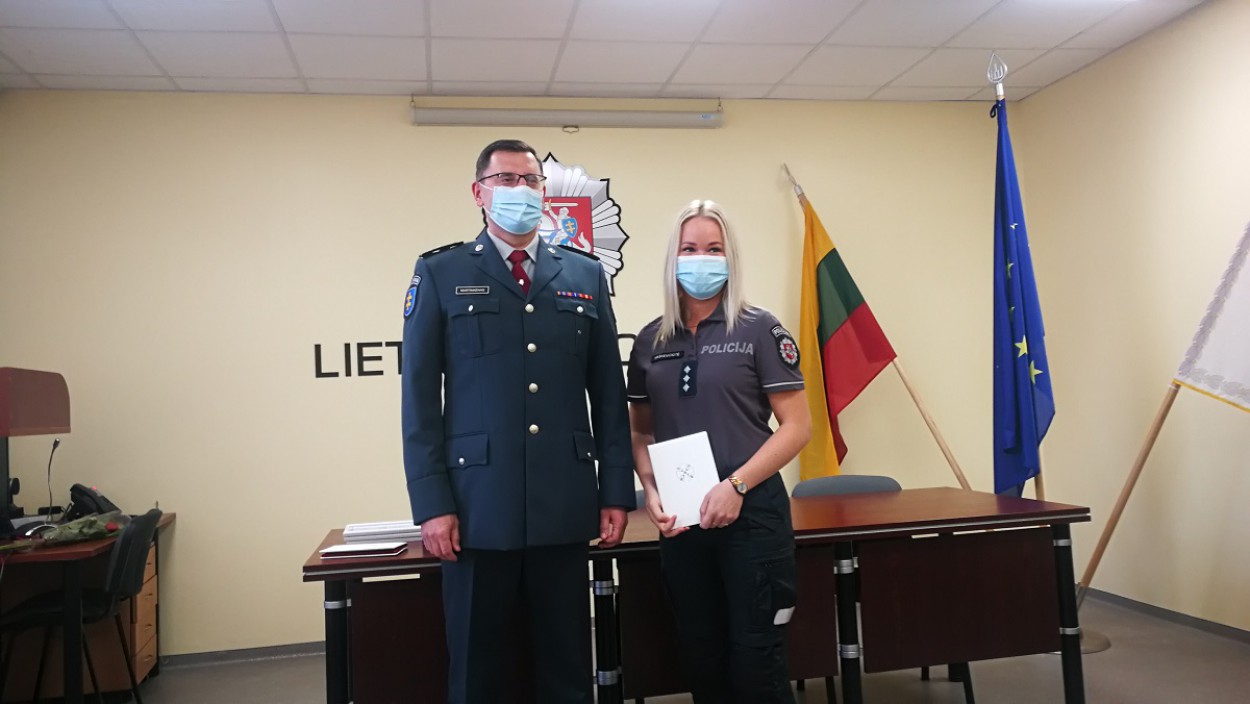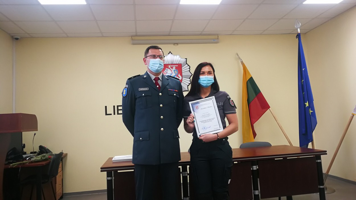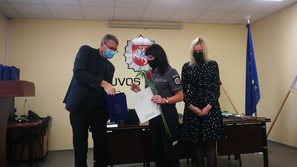 Vardinėmis dovanomis apdovanoti: Jonavos rajono policijos komisariato veiklos skyriaus vyresnysis tyrėjas komisaras inspektorius Justinas Sabatauskas ir Jonavos rajono policijos komisariato veiklos skyriaus vyresnioji tyrėja komisarė inspektorė Indrė Gudauskaitė.