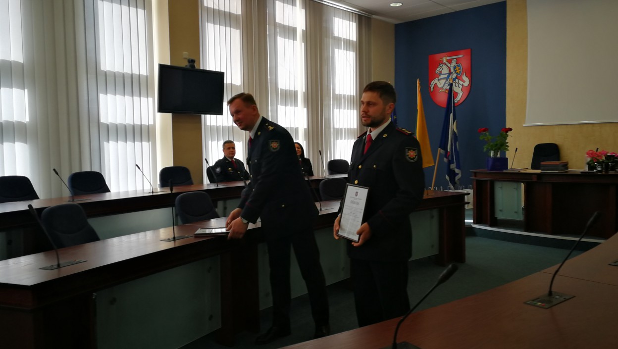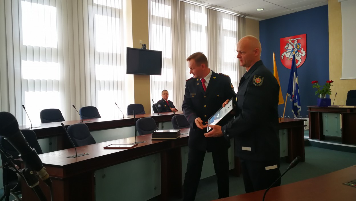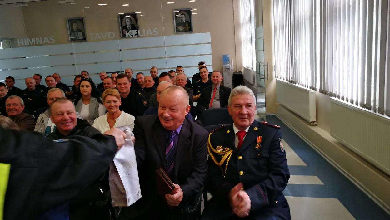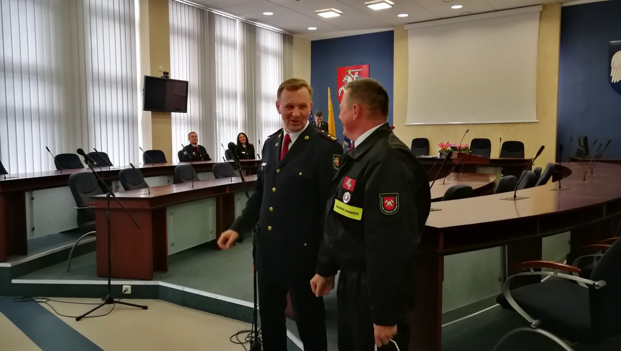 Valstybinės priešgaisrinės gelbėjimo tarnybos pasižymėjimo ženklu už nepriekaištingą 20 metų tarnybą, Ugniagesio gelbėtojo žvaigžde apdovanotas Jonavos rajono priešgaisrinės tarnybos viršininkas Vygaudas Čižauskas.