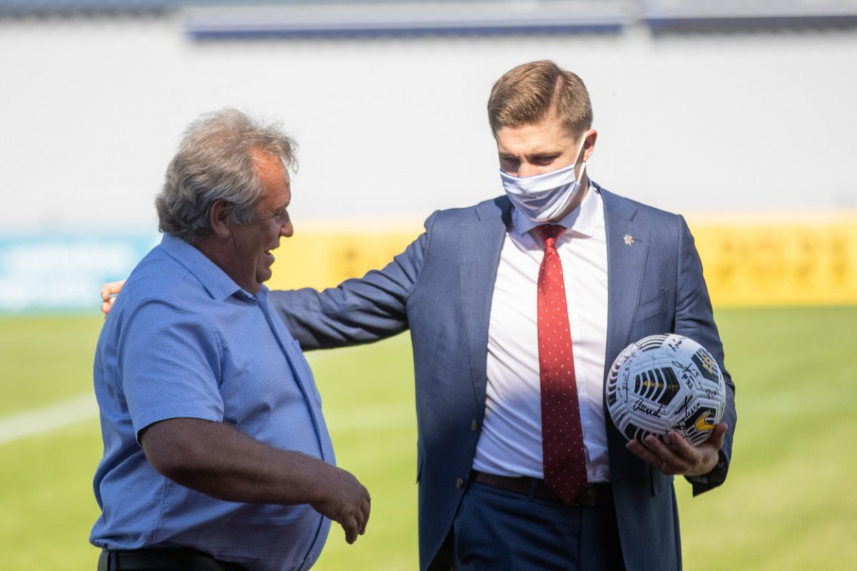 Su įgyvendintu projektu rajono merą pasveikino Jonavoje išrinktas Seimo narys Eugenijus Sabutis, o stadioną rekonstravusios Marijampolės bendrovės „Statybos ritmas“ generalinis direktorius Gintaras Vilutis merui įteikė futbolo kamuolį su „Sūduvos“ futbolo klubo žaidėjų parašais: „Linkiu Jonavai daug pergalių, taurių ir medalių, o tada ir šis stadionas bus pilnas sirgalių“.
