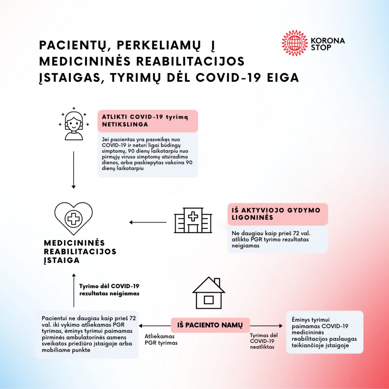 Siekiant užtikrinti efektyvų COVID-19 tyrimų atlikimą prieš stacionarines paslaugas ir medicininę reabilitaciją, atnaujinta tyrimų dėl koronaviruso tvarka. Atsirado galimybė tokiems pacientams atlikti tyrimą paimant ėminį iš paciento nosiaryklės ir ryklės mobiliame punkte.