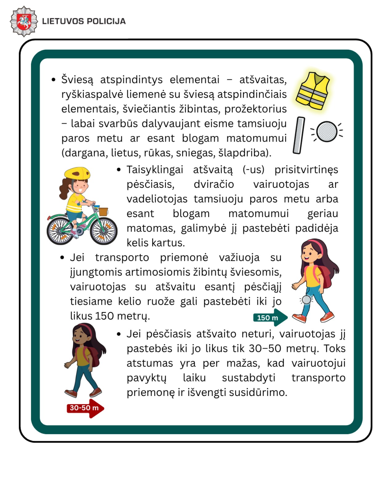 Įsidėmėkite, kad tamsiuoju paros metu, esant blogam matomumui, pažeidžiamiems eismo dalyviams – pėsčiajam, dviračio, elektrinės mikrojudumo priemonės vairuotojui būti saugesniam kelyje gali padėti ir padeda šviesą atspindintys elementai – atšvaitas, ryškiaspalvė liemenė su šviesą atspindinčiais elementais, šviečiantis žibintas, prožektorius.