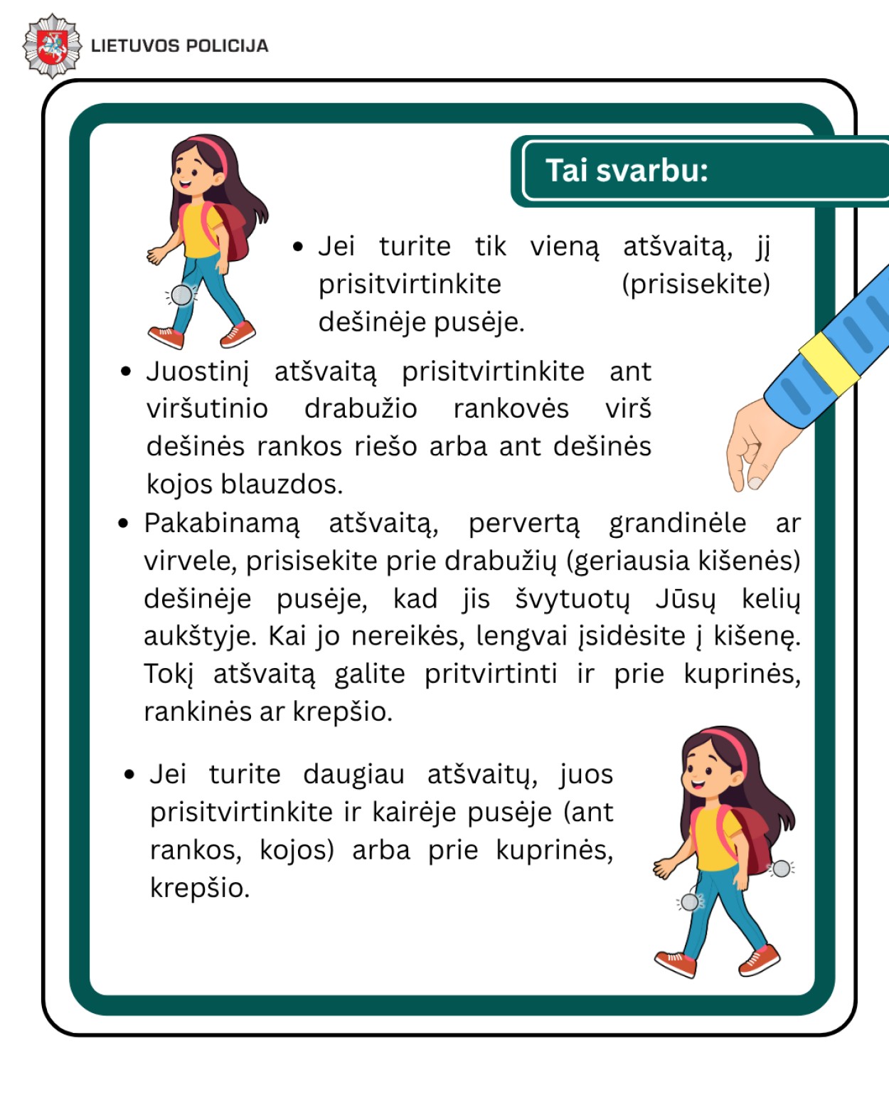 ● Turint vieną atšvaitą (ir einant kelkraščiu, važiuojamosios kelio dalies pakraščiu prieš transporto priemonių judėjimo kryptį), jis turi būti pritvirtintas dešinėje pusėje.