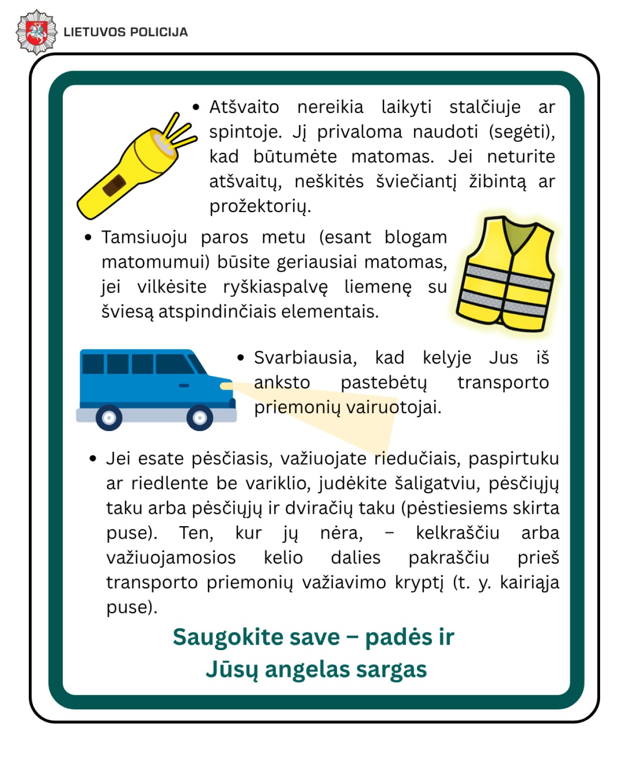 ● Turėti ir tinkamai naudoti tamsiuoju paros metu (esant blogam matomumui) matomumą gerinančias saugos priemones – atšvaitus, ryškiaspalves liemenes su šviesą atspindinčiais elementais, šviečiančius žibintus.