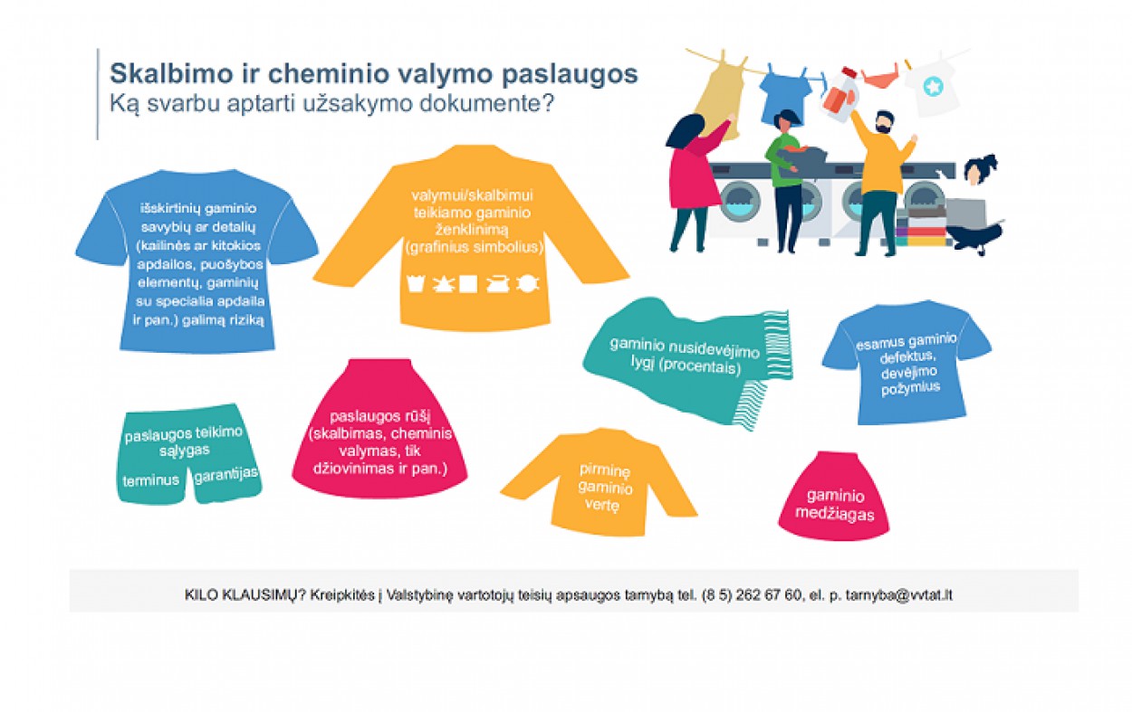 Kiekvieno verslininko pareiga – prieš sudarant sutartį su vartotoju aiškiai ir suprantamai informuoti apie teikiamas paslaugas. Neįvykdęs šios pareigos verslininkas turi atlyginti dėl to vartotojo patirtus nuostolius. Prieš paliekant gaminį valymui, vartotojas ir verslininkas turėtų sudaryti raštišką paslaugų teikimo sutartį (tai gali būti užsakymo kvitas ar panašus dokumentas), kurioje kiek įmanoma aiškiau ir konkrečiau aprašomos paslaugų teikimo sąlygos bei valymui pateikto gaminio būklė, savybės. Taip ginčo atveju bus galima įrodyti, dėl kokių paslaugų teikimo sąlygų ir kiek išsamiai jūs susitarėte. Pasirašant cheminio valymo paslaugų sutartį patariame atidžiai įvertinti šią joje fiksuojamą informaciją: