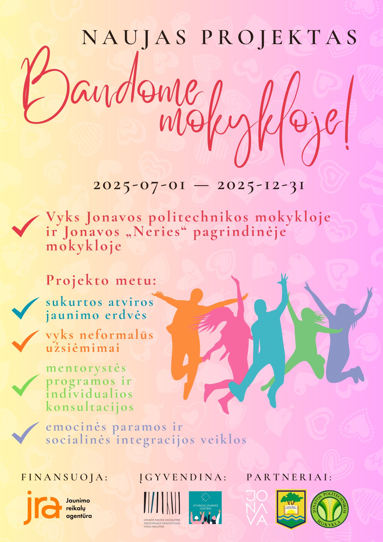 Projekto tikslas - sukurti ir išbandyti inovatyvias darbo su jaunimu paslaugas Jonavos rajono savivaldybės mokyklose, siekiant gerinti jaunų žmonių emocinę savijautą, skatinti jų įsitraukimą į mokyklos bendruomenę ir ugdyti socialinius bei darbo rinkai reikalingus įgūdžius vadovaujantis darbo su jaunimu organizavimo ugdymo įstaigose rekomendacijas.