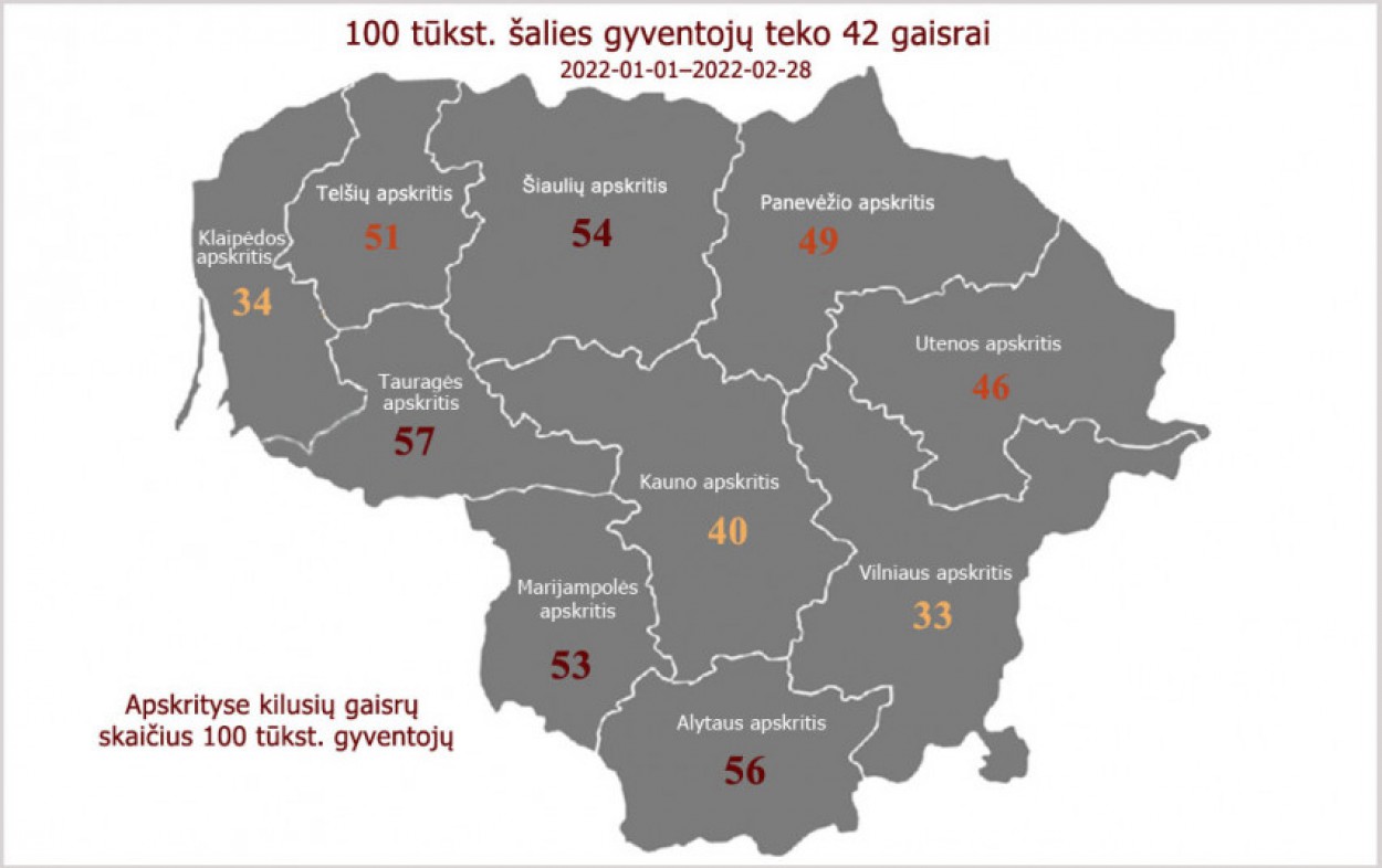 Kaip skelbia Priešgaisrinės apsaugos ir gelbėjimo departamentas, per du šių metų mėnesius šalyje kilo 1176 gaisrai, jų metu žuvo 16 žmonių, o 19 gyventojų patyrė traumų. Palyginti su praėjusių metų tuo pačiu laikotarpiu, kai buvo užgesinti 1453 gaisrai, o juose žuvo 30 gyventojų, šiemet kilo 19 proc. mažiau gaisrų ir juose žuvo 14 gyventojų, arba 47 proc., mažiau. Tai mažiausias gaisrų ir juose žuvusių žmonių skaičius per 19 metų.