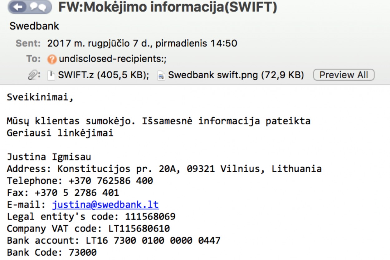 „Swedbank“ perspėja įmones dėl banko vardu siuntinėjamų melagingų el. laiškų, kuriais informuojama apie tariamai atliktą mokėjimą. Tariamo mokėjimo informacija siunčiama prisegtame faile, kuris iš tiesų yra kenkėjiška programa. Bankas perspėja tokių prisegtų failų jokiu būdu neatidarinėti.