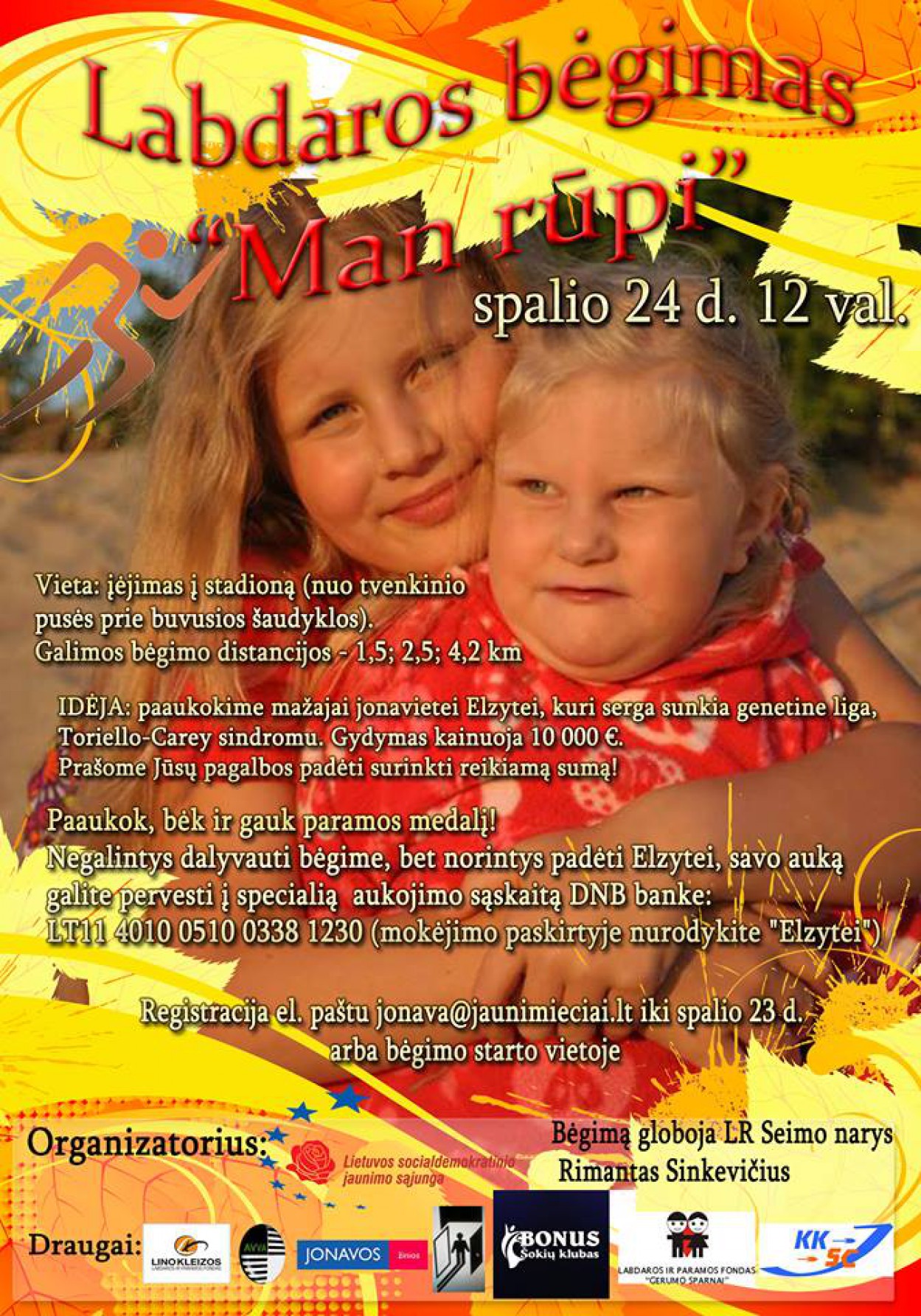 Lietuvos socialdemokratinio jaunimo sąjungos Jonavos skyriaus (LSDJS) nariai kviečia visus jonaviečius dalyvauti labdaros bėgime „Man rūpi“ ir paremti jauną šeimą, auginančią reta genetine liga sergančią dukrytę Elzę.