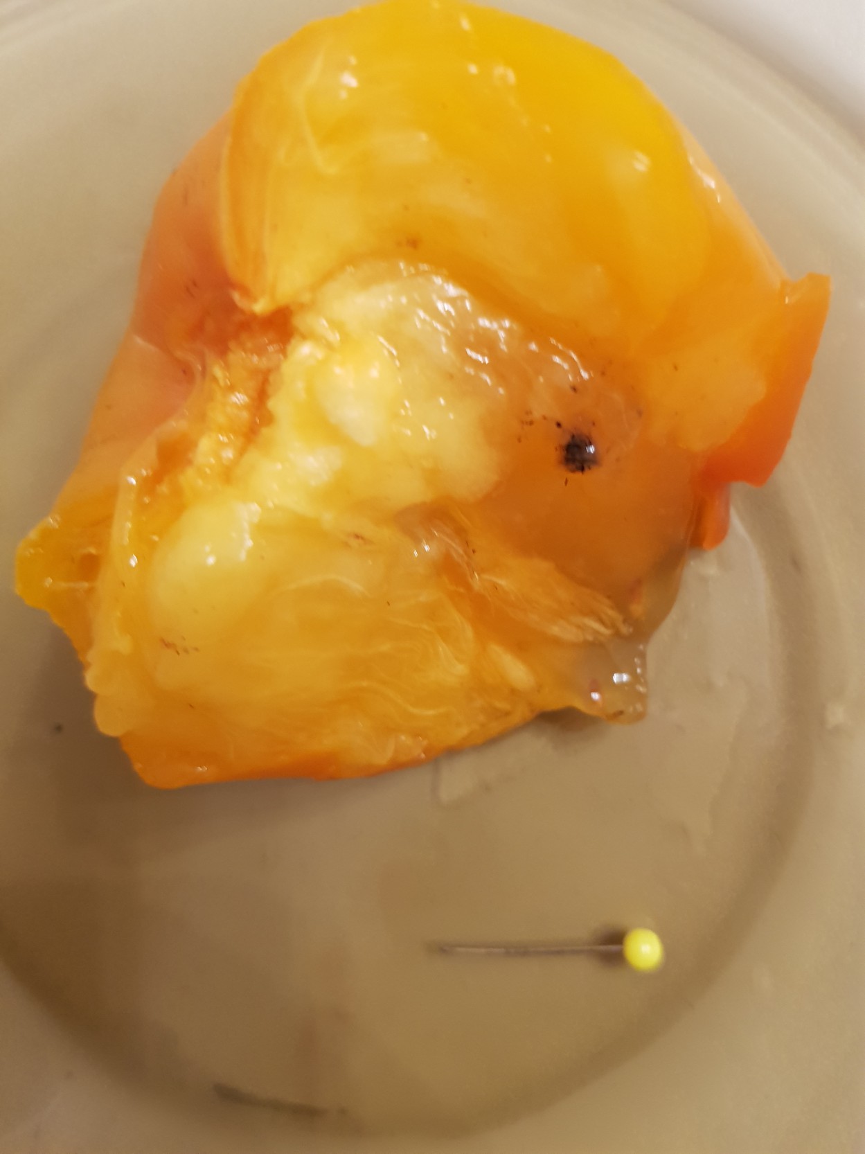 „Spalio 14 d. apsipirkau Žeimių g. esančioje Norfos parduotuvėje. Radinys įdūrė, o ištraukus iš burnos - šokiravo! Persimonus ir radinį nunešiau į parduotuvę...“, - rašo Rasa ir atsiunčia nuotrauką, kurioje aiškiai matosi šalia persimono vaisiaus padėta nedidelė adata.