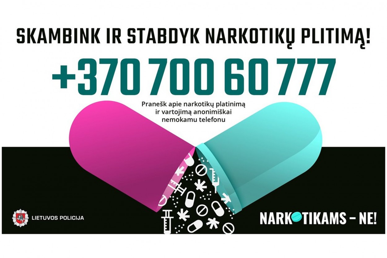 Primename, kad telefono numeriu +370 700 60 777 galima pranešti apie žinomus narkotikų platinimo atvejus. Telefono linija veikia darbo dienomis nuo 7 val. iki 20 val.