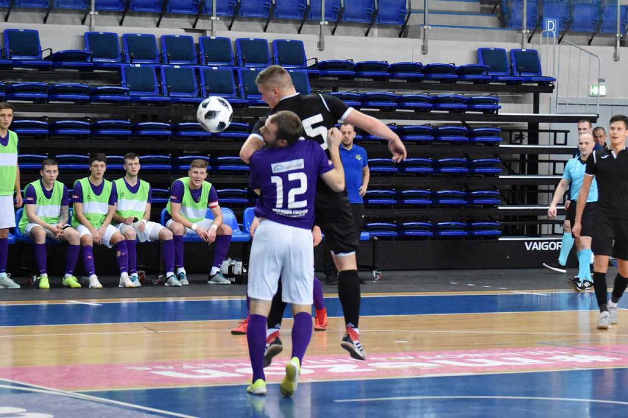 Visgi, pirmajame kėlinyje jonaviečiai žaidė labai pasyviai ir tik vienintelę realią progą pasižymėti turėjęs Benas Spietinis jos neišnaudojo. Tuo tarpu sostinės salės futbolininkai užtikrintu tempu ir pasitikėdami savimi išnaudojo „Vikingų“ žaidėjų klaidas gynyboje ir poilsiui ekipos išėjo švieslentei rodant neigiamą jonaviečiams rezultatą 0:2.
