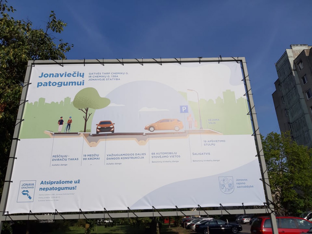 Prasidėjo pasiruošimas naujo kelio Chemikų gatvėje statybai - pastatyta informacinė lenta, įrengti riboženkliai.
