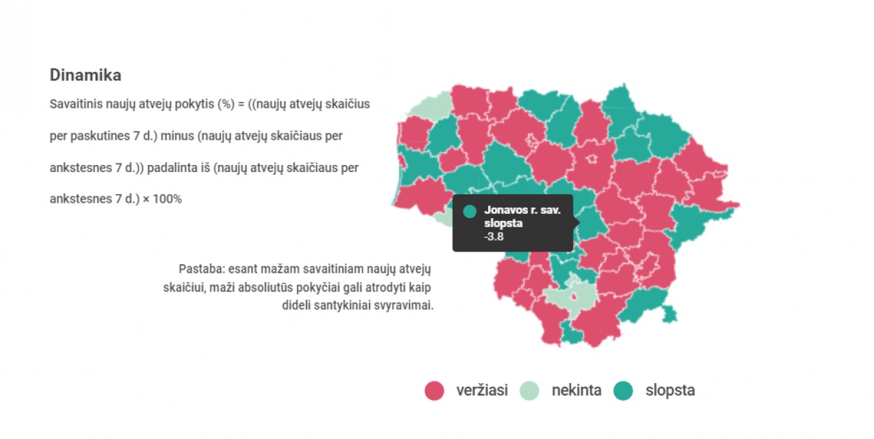 Anot oficialios statistikos portalo, savaitinio naujų atvejų pokyčio dinamika yra slopstanti, 7 dienų naujų atvejų pokytis: -3,8 proc.