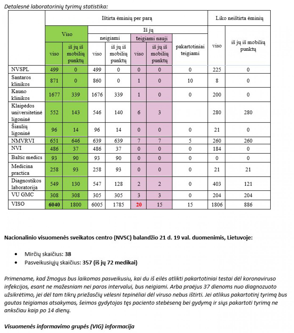 Nacionalinio visuomenės sveikatos centro (NVSC) balandžio 21 d. 19 val. duomenimis, Lietuvoje: