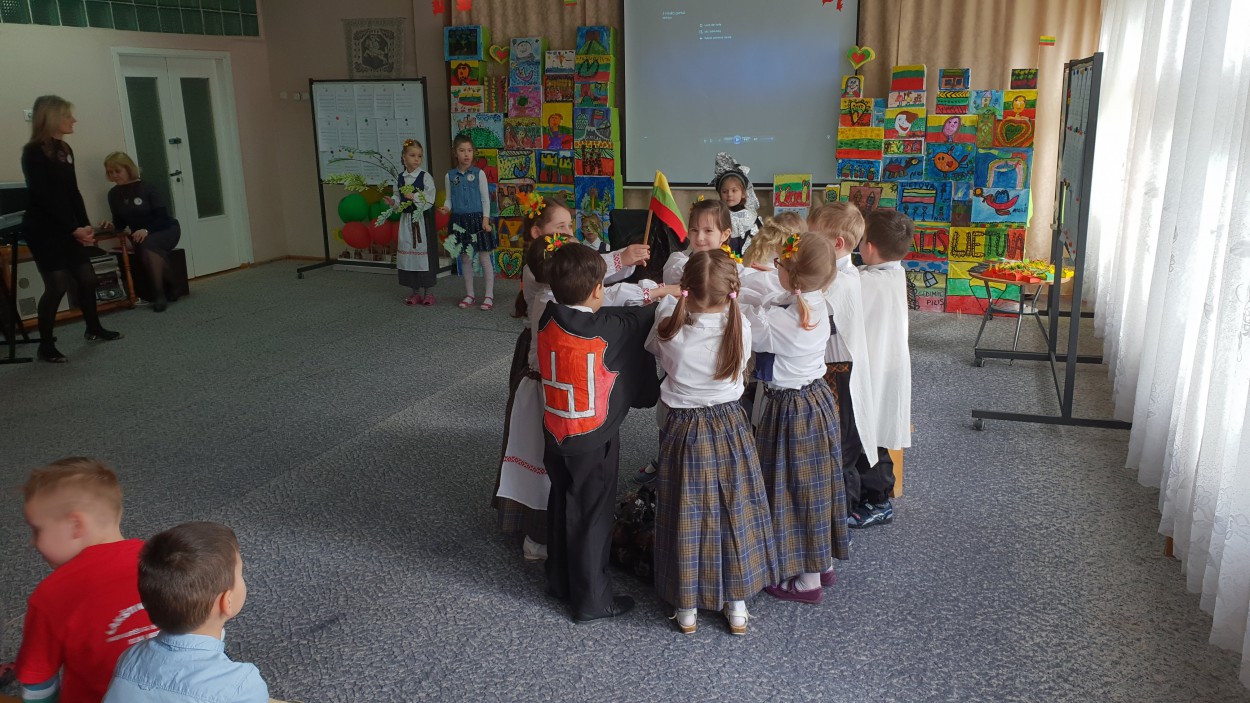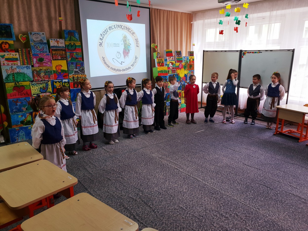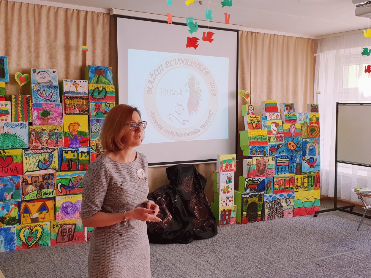 Justino Marcinkevičiaus tekstus apie gimtąjį kraštą nurašinėjo suaugusieji. Priešmokyklinukai vedžiojo žodelius: Lietuva, šalis, tėvynė, Jonava.