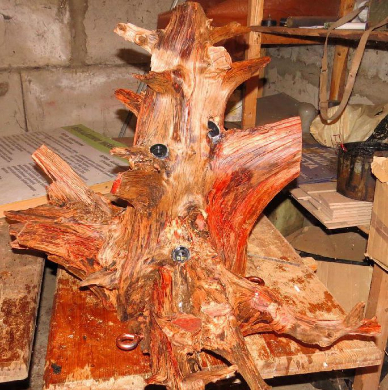 Metus laiko senas pušies kelmas buvo džiovinamas, paskui girininkas jį sutvarkė – visų pirma, nušveitė vieliniu šepečiu, o po to kelmą paruošė šviestuvo gamybai, išvedžiojo elektros laidus.