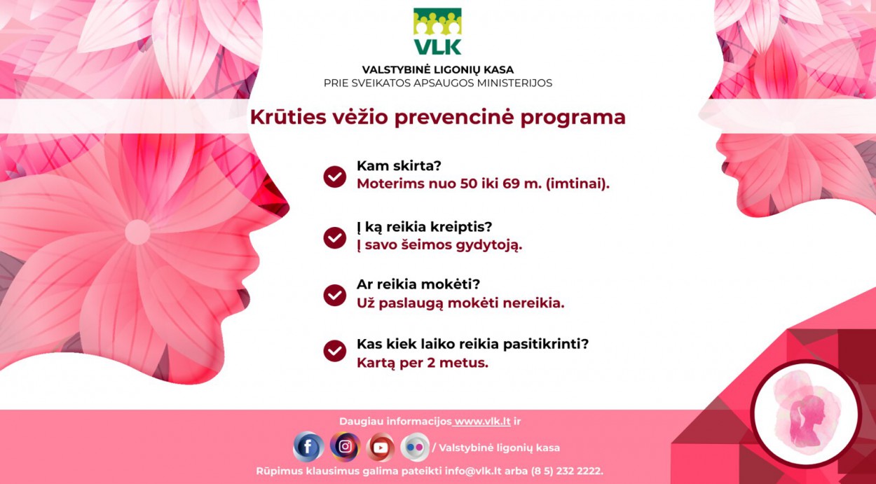 Per pirmuosius septynis šių metų mėnesius prevenciškai dėl krūties vėžio pasitikrino 6 000 moterų daugiau nei tuo pat metu pernai. Valstybinės ligonių kasos prie Sveikatos apsaugos ministerijos (VLK) specialistai džiaugiasi didėjančiu gyventojų aktyvumu bei ragina ir kitas moteris jungtis prie savo sveikata besirūpinančiųjų būrio ir tokiu būdu užkirsti kelią šiai klastingai ligai.