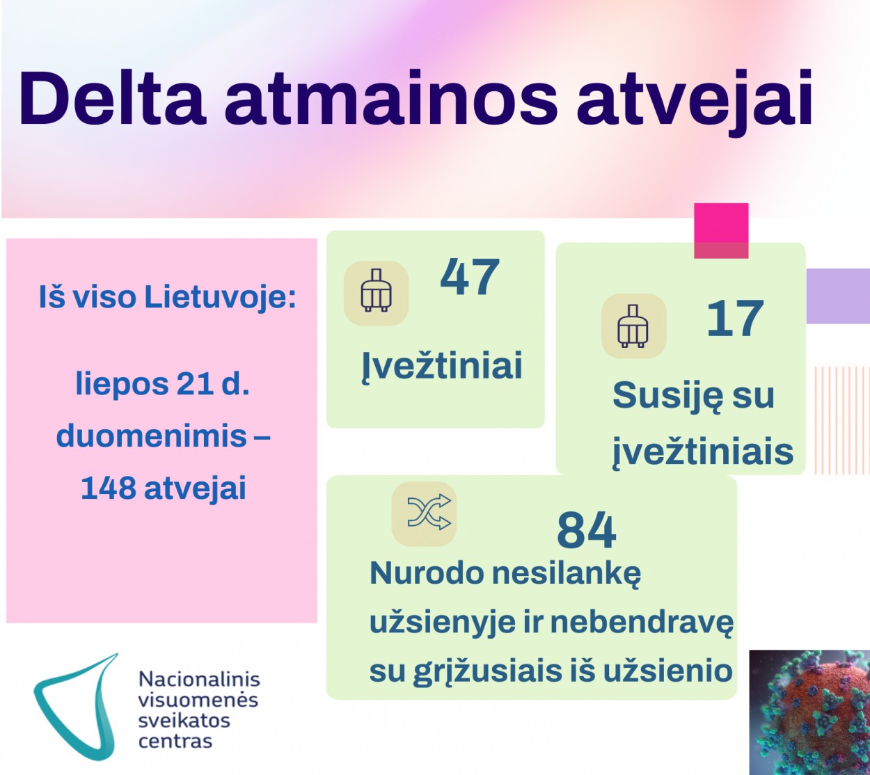 Nacionalinis visuomenės sveikatos centras (NVSC) informuoja, kad Lietuvoje iš viso registruoti 148 delta koronaviruso atmainos atvejai. Daugiausiai – po 44 atvejus – Vilniaus ir Klaipėdos apskrityse.