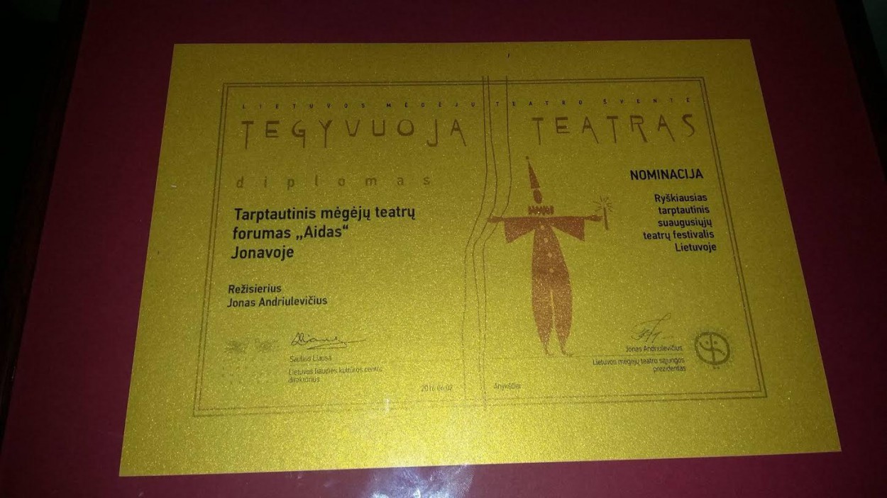 Šįkart Jonavos rajono savivaldybės teatras nominuotas kaip „Ryškiausias Lietuvos mėgėjų teatro ambasadorius“ už dalyvavimą 2015 m. Baltijos šalių teatrų festivalyje „Baltijos rampa“ Estijoje; jam įteikta nominacija „Ryškiausias tarptautinis suaugusiųjų teatrų festivalis Lietuvoje“ už tarptautinio mėgėjų teatrų festivalio „Aidas“ organizavimą Jonavoje; nominacija „Ryškiausias edukacinis teatro projektas“ įvertintas Jonavos rajono savivaldybės teatro projektas „Lygybės medis“, teatro integracinė kūrybinė laboratorija socialinės atskirties grupėms ir neįgaliesiems. Taip pat nominacija „Ryškiausias leidinys apie mėgėjų teatrą“ įvertintas Jonavos rajono savivaldybės teatro 30-čiui išleista knyga „Teatro ieškojimas“, o nominacija „Už nuopelnus Lietuvos mėgėjų teatrui“ įteikta Reginai Kestenienei, Jonavos rajono savivaldybės teatro direktorei, Lietuvos mėgėjų teatro sąjungos sekretorei.