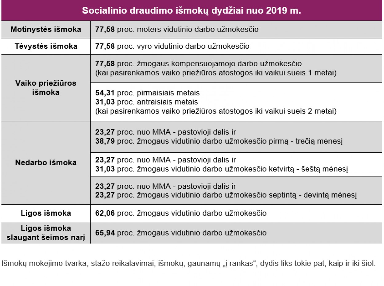 Nuo 2019 m. sujungus darbuotojo ir darbdavio mokesčius ir darbuotojų atlyginimams „ant popieriaus“ padidėjus 1,289 karto, keičiama procentinė „Sodros“ išmokų išraiška. Lentelėje nr. 1 rasite socialinio draudimo išmokų dydžius nuo 2019 m.