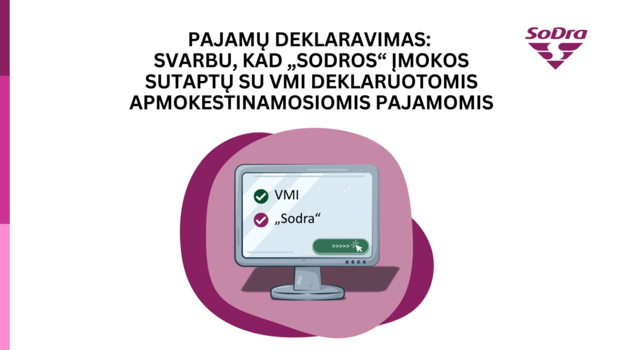Deklaruojant pajamas svarbu atkreipti dėmesį į tai, kad metinė suma, nuo kurios sumokėtos „Sodros“ įmokos ir VMI deklaruota apmokestinamųjų pajamų sutaptų. Tai reiškia, kad negalima sumokėti daugiau įmokų, nei siekia gyventojo deklaruotos pajamos, kadangi socialinio draudimo įmokų bazė visuomet yra susijusi su apmokestinamomis pajamomis.