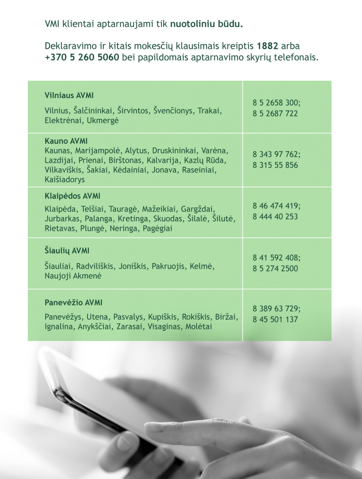 Deklaravimo laikotarpiu konsultacijas telefonu teiks ir deklaracijas padės pildyti mokesčių specialistai visoje šalyje, paskambinus numeriu 1882 (pasirinkimas 1 – „Gyventojų pajamų deklaravimas“) ar kitais papildomais telefonų numeriais, kurie skelbiami VMI internetinėje svetainėje.