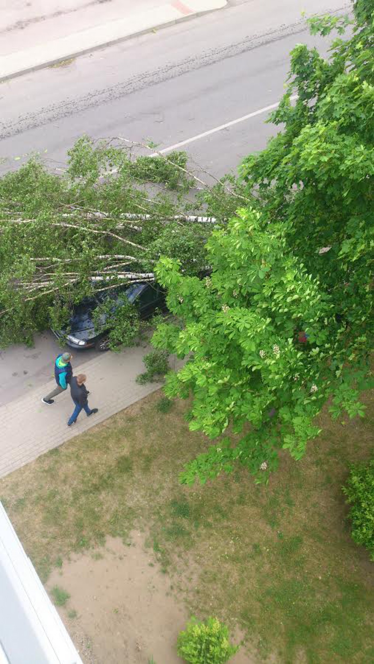 Maždaug po valandos jonaviečiai pranešė, jog Panerių gatvėje medis nuvirto ant automobilio „Volvo S 80“. Medis patrauktas, tačiau krisdamas jis apgadino automobilio bagažinę ir stogą.