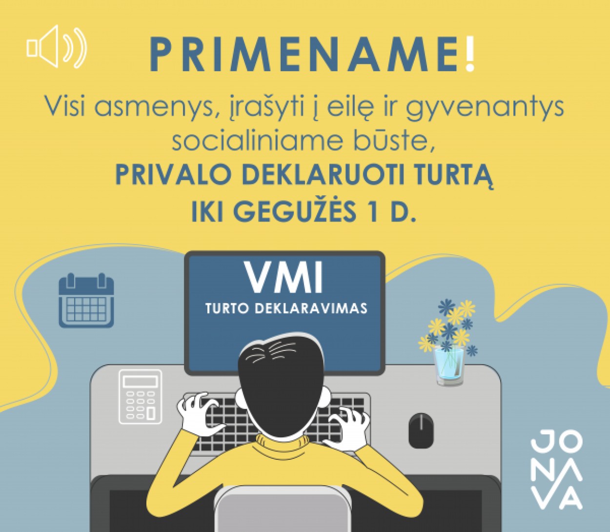 Turto ir aplinkos apsaugos skyrius primena, kad vadovaujanti LR valstybės paramos būstui įsigyti ar išsinuomoti įstatymu, visi asmenys, kuriems nustatyta teisė į socialinio būsto nuomą, taip pat asmenys, gyvenantys socialiniame būste, privalo kasmet, ne vėliau, kaip iki gegužės 1 d., deklaruoti šeimos turtą (įskaitant gautas pajamas) už kiekvienus praėjusius kalendorinius metus.