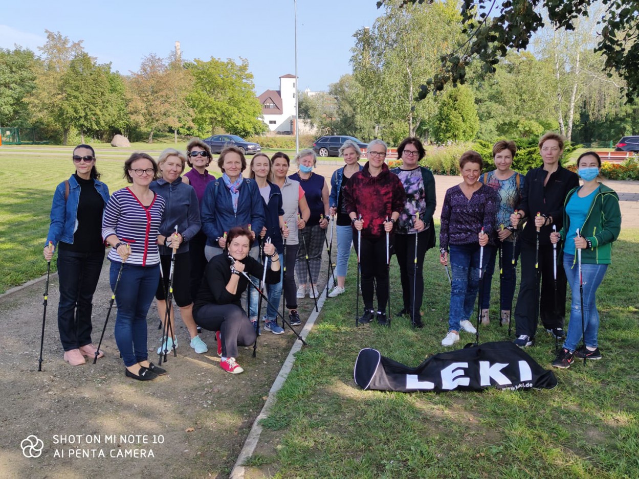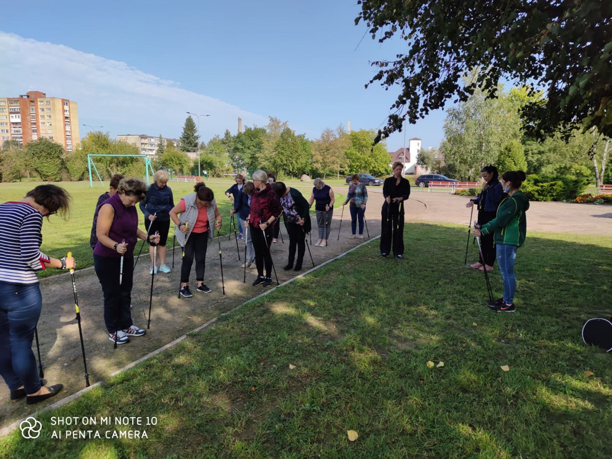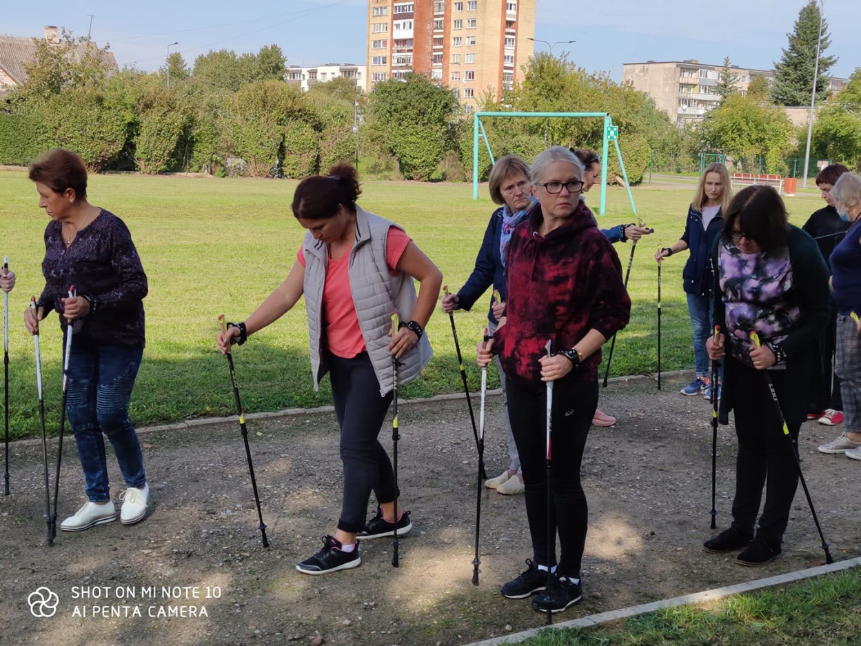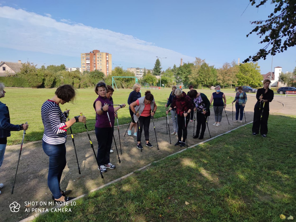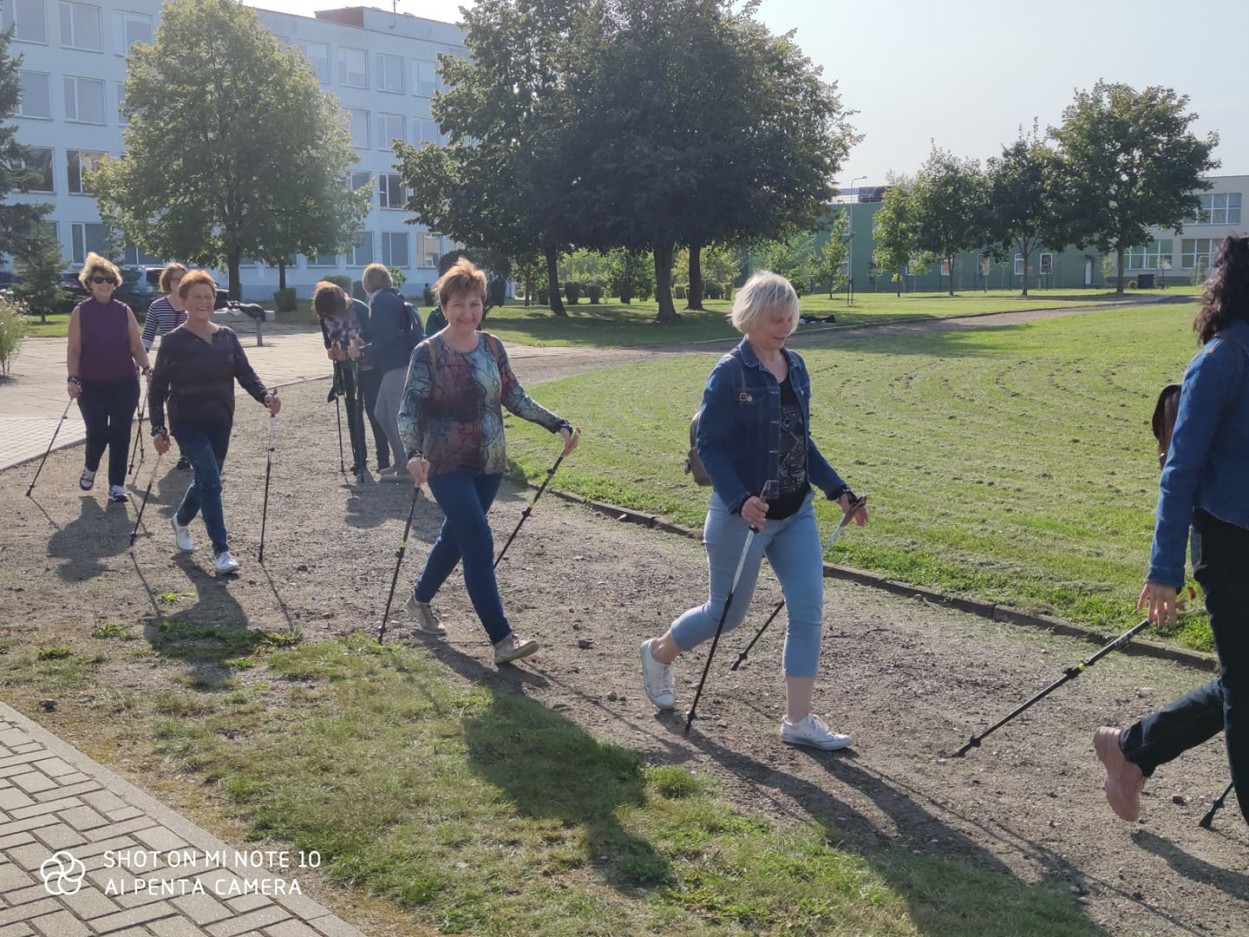 Po pamokų smagus būrelis mokytojų susirinko mokyklos stadione. Visuomenės sveikatos stiprinimo specialistė ir jaunimo koordinatorė S. Metlevskienė papasakojo apie šiaurietiškojo ėjimo naudą organizmui. Sužinojome, kad šiaurietiškasis ėjimas tinka bet kurio amžiaus žmonėms. Toks ėjimas atsiremiant lazdomis įdarbina daugiau kaip 90 procentų viso kūno raumenų. Instruktorė parodė, kaip susireguliuoti lazdų aukštį, paaiškino svarbiausias taisyklingo ėjimo su šiaurietiškomis lazdomis taisykles.