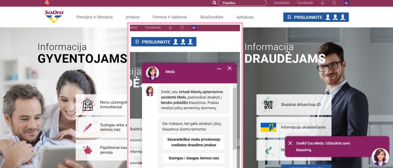 Virtuali asistentė Meda teikia informaciją apie savarankišką privalomojo sveikatos draudimo (PSD) įmokų mokėjimą bei ligos išmokas. Ji taip pat gali padėti užsiregistruoti vizitui į „Sodrą“ bei pateikti teritorinių skyrių kontaktinę informaciją. Šios temos parinktos pagal dažniausiai klientų užduodamus klausimus skambučių centro darbuotojams ir www.sodra.lt internetinės svetainės naršymo duomenis.