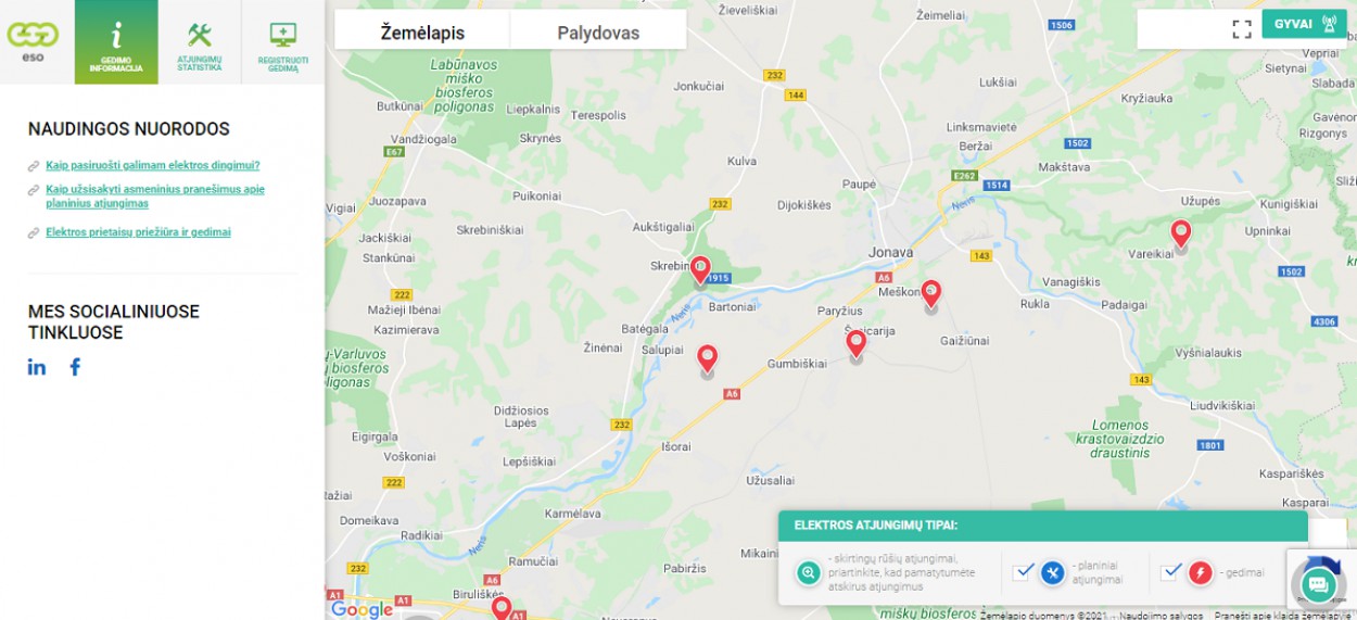 Interaktyviame žemėlapyje galima sužinoti, kurioje vietovėje atjungti elektros skirstymo tinklo įrenginiai, taip pat pranešti apie elektros energijos tiekimo sutrikimą. Žemėlapis pasiekiamas adresu www.eso.lt/zemelapis