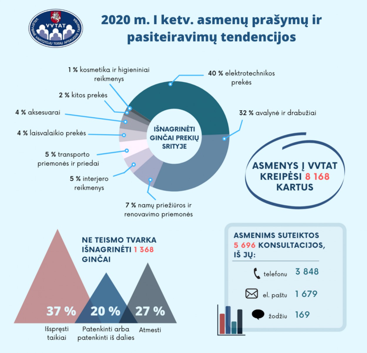 Kovo mėnesį, šalyje paskelbus karantiną, laisvalaikio paslaugų sektoriuje fiksuotas rekordinis vartotojų pasiteiravimų dėl kelionių ir renginių šuolis – suteiktos 1 002 konsultacijos. Tačiau, vertinant ne teismo tvarka išnagrinėtus vartojimo ginčus, pagal jų skaičių pirmą vietą užima elektrotechnikos prekių sektorius. Vartotojai dažniausiai skundėsi mobiliųjų telefonų, kompiuterių, televizorių bei įvairių buitinių prietaisų kokybe. Iki tol ilgą laiką didžiąją išnagrinėjamų vartojimo ginčų dalį sudarė ginčai dėl avalynės bei drabužių.