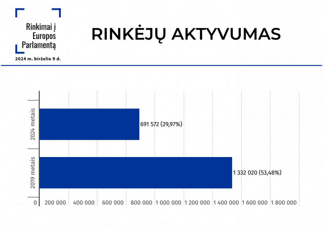 Sulaukusi rezultatų iš Lietuvos diplomatinių atstovybių užsienyje, kurios iki penktadienio laukė paštu keliaujančių užsienio valstybėse balsavusių rinkėjų biuletenių, VRK skelbia, kad rinkimuose į Europos Parlamentą iš viso dalyvavo 691 572 rinkėjai arba 28,97 proc. nuo bendro rinkėjų skaičiaus (2 387 327).